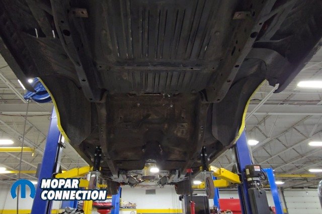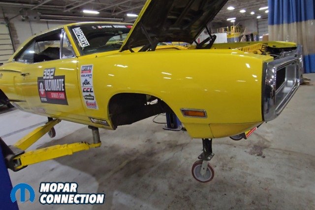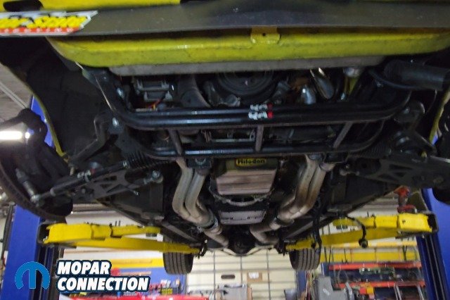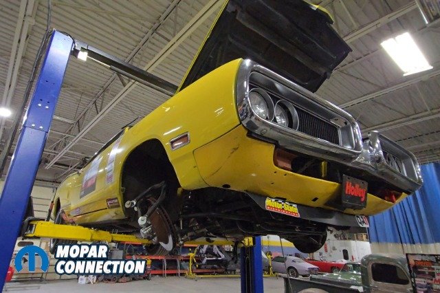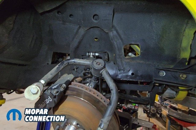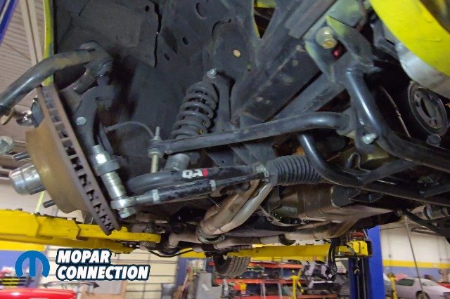 Above: With the Super Bee on the lift, the suspension is loosened to prepare for dropping the entire drivetrain at once with the QA1 suspension still attached.