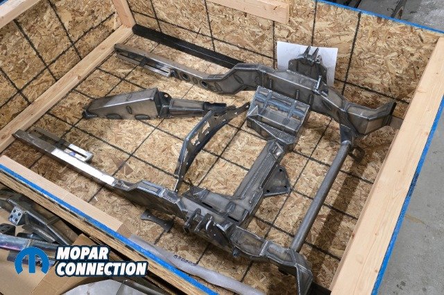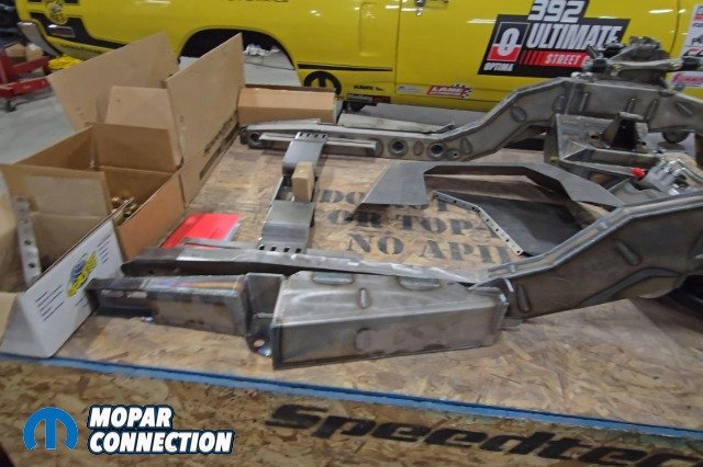 Above left & right: The Speedtech Extreme sub-frame shown here in bare metal alongside the replacement torque boxes it mounts to. This section will be tied into the car’s structure and painted body color to blend seamlessly with the Super Bee’s undercarriage. With this setup, the car can fit tires wider than 315s up front.