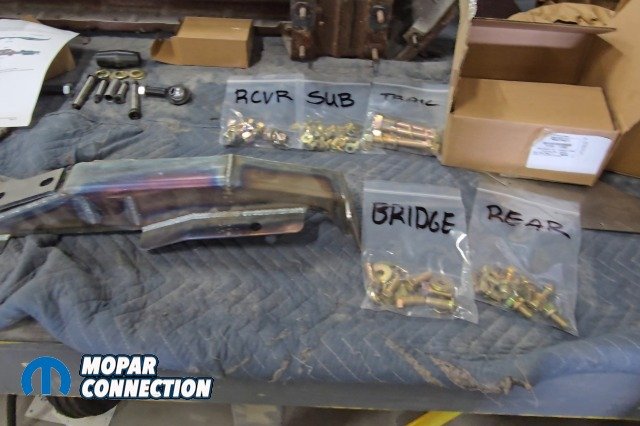Above left to right: The ‘bridge’ crossmember for mounting the torque arm, shown with all included hardware.