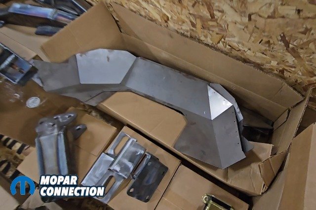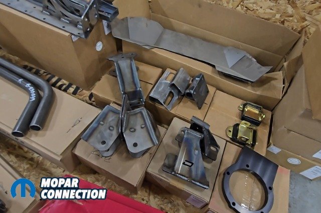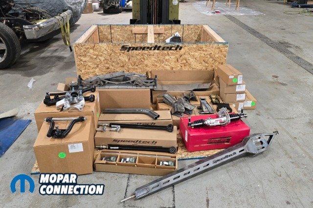 Above left: Speedtech Performance’s Extreme front suspension system shown fully assembled. This complete clip replaces the factory front frame rails, steering, and suspension in one package. Above middle: Speedtech’s rear torque arm suspension system displayed in full. Paired with the extreme front clip, it transforms a classic Mopar into a true Pro-Touring machine. Both systems are also available together as Speedtech’s track time package for those wanting the full upgrade. Above right: All of Speedtech Performance’s components arrive in one large crate, Shown here unpacked, the parts are laid out ready for assembly, with certain pieces requiring paint before use.