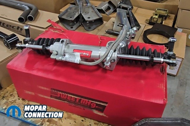 Sweet Manufacturing rack and pinion steering system replaces the old steering for a direct, modern steering feel. The rack improves geometry to add ackerman. Ackerman is the steering geometry that makes the inside front wheel turn sharper than the outside wheel in a corner, so both roll smoothly without scrubbing.
