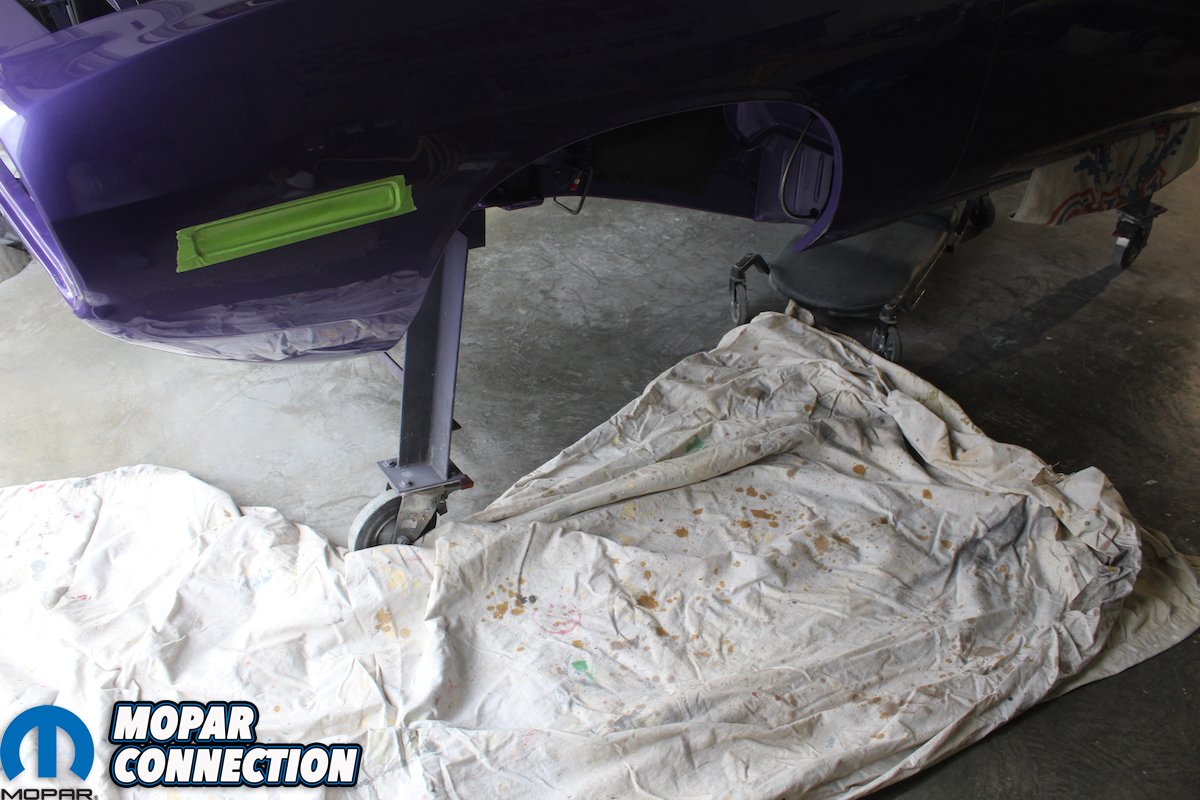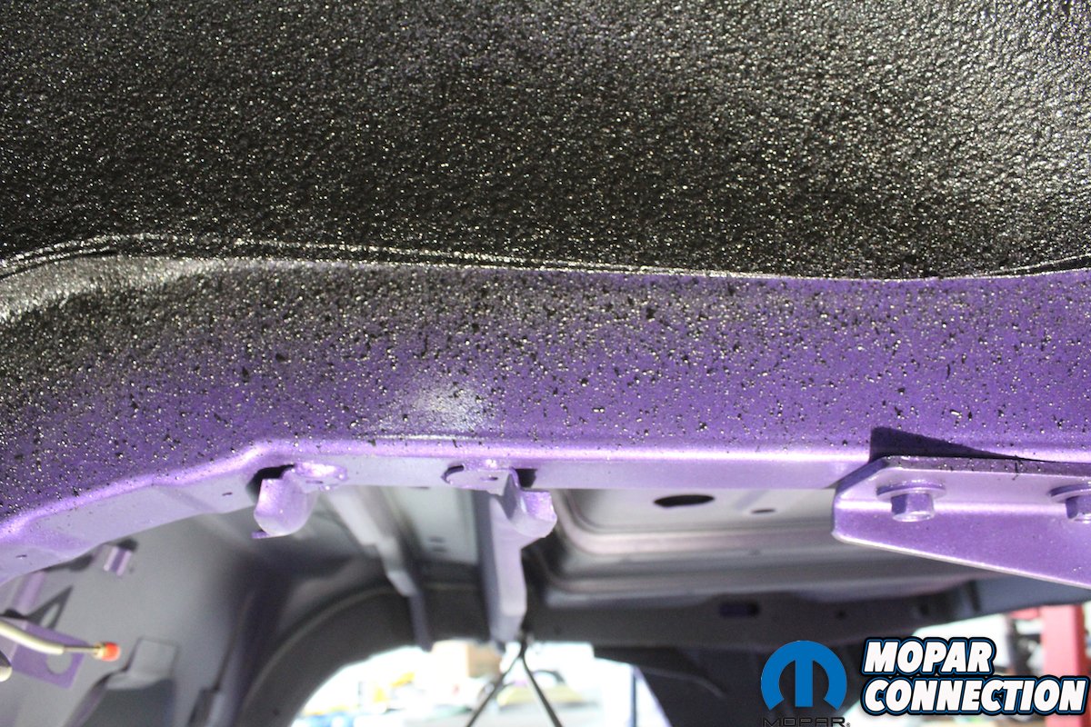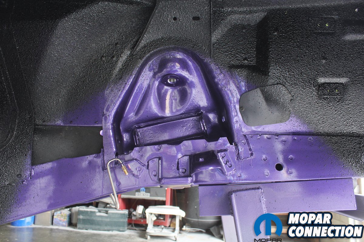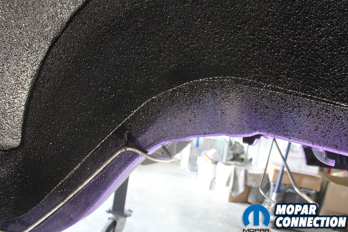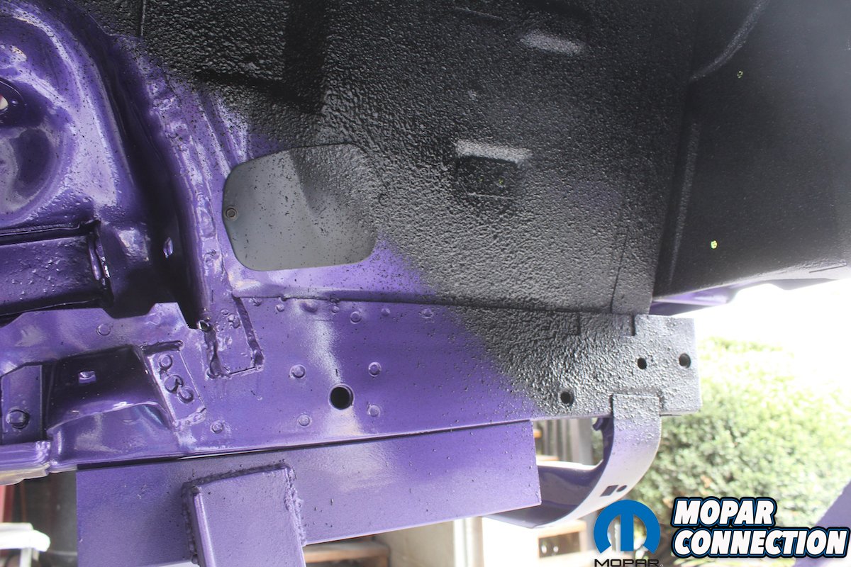 We have seen some cars that do not apply the undercoating to the wheel wells at car shows. The paint inside the wheel wells shows up and if the car is a light color it just looks…well, bad, especially behind the front wheel and tire. We have also seen cars that masked of these areas so that the undercoating does not bleed over onto the metal lines and frame rails. If you have been following the build of the Comeback ‘Cuda you know by now that is not the way we roll.