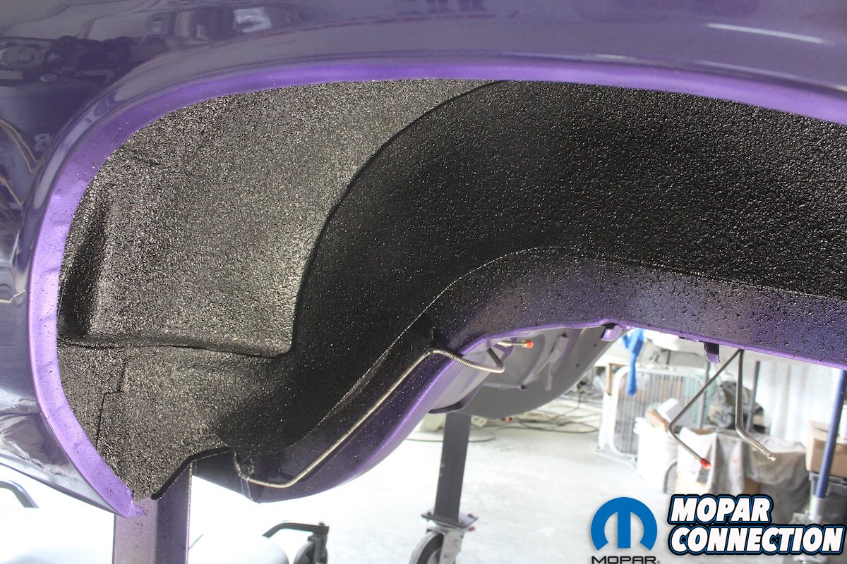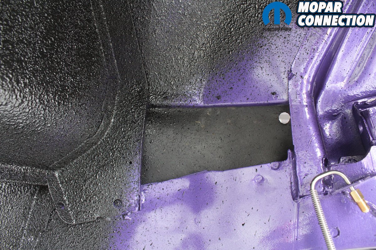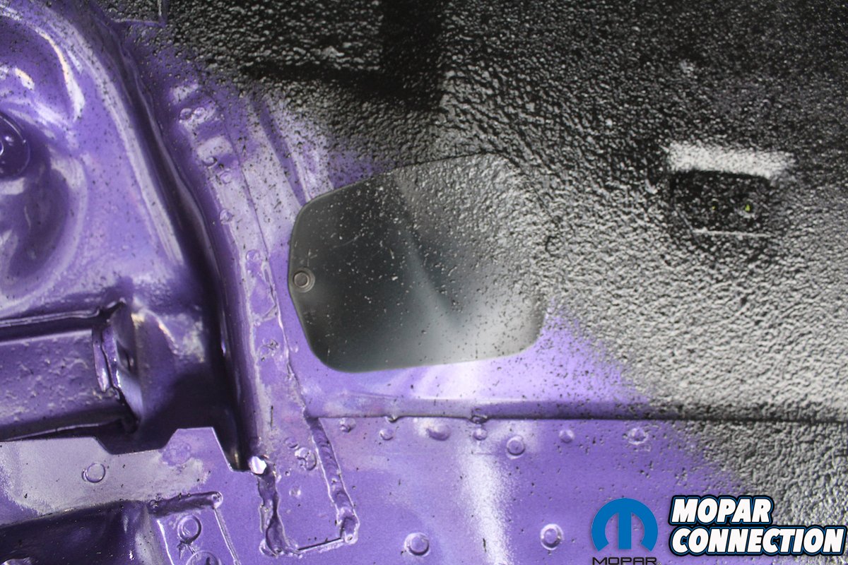 Above left: At the time we undercoated the Comeback ‘Cuda we only had three correct access plate hex head screws. We used the incorrect one in the rear of the plate so it could easily be replaced with a correct one. Above right: The rubber inner fender splash shield mounts from the engine compartment on the passenger side facing out. We see more times than not this shield mounted incorrectly. Most people mount this just the opposite from the outside facing in.