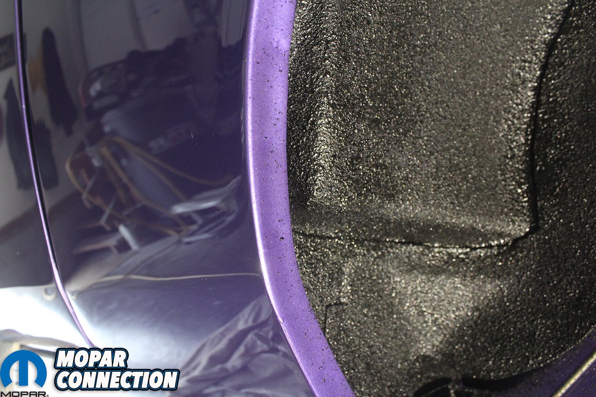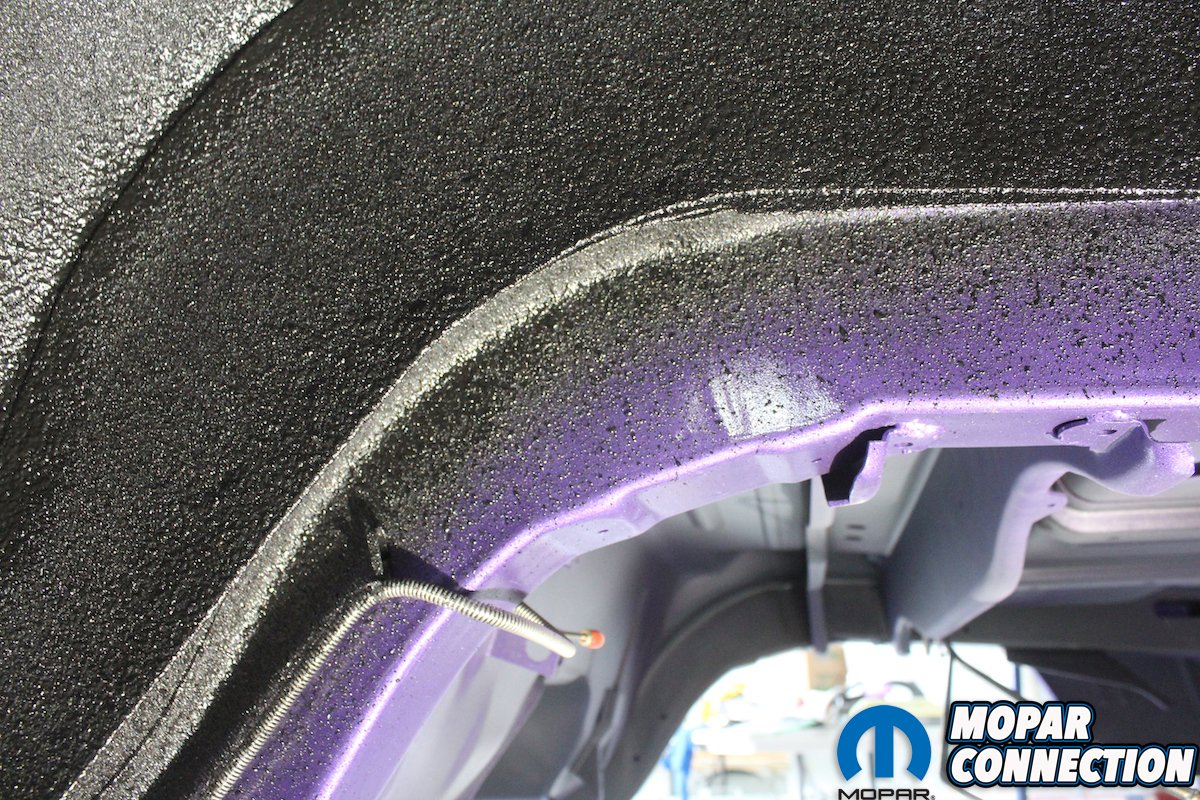 There should be enough of the gallon previously used on the inside of the quarter panels before paint to be able to cover the wheel wells after paint. You also use the same gun that was used before with the nozzle enlarged to create the thick spray patterns found on these cars.