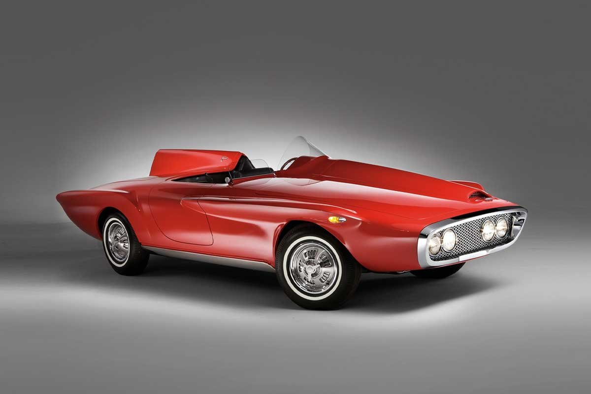 Above Left: The Chrysler XNR concept car, designed by Virgil Exner, had styling elements aligned with Winfield’s futuristic approach. (Photo – RM Sotheby’s) Above Right: While not directly built by Winfield, the Plymouth Atomic Punk Bubbletop extreme custom was heavily inspired by his work. It featured his signature blended paint fade, bubble canopy, and a futuristic, hot rod look. (Photo – b!INE)