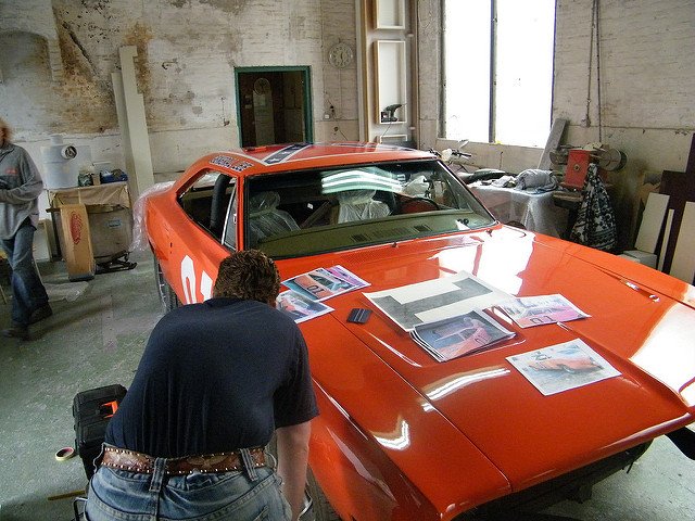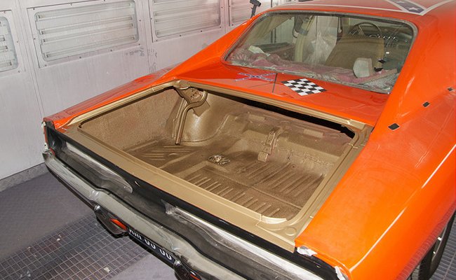 If you choose not to paint it T3 first, just paint the exterior orange with the emphasis on getting orange overspray into the hood and trunk panel gaps where it’ll be T3. We will note that for General Lees used for scenes where the hood was open, the crew building them shot the engine bay in a very cheap coat of black paint to cover up whatever the original color of the car used was.