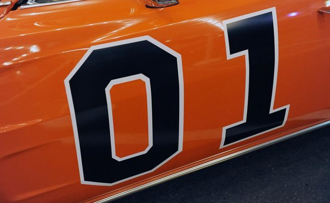 DECALS: On the original General Lee #1, the Confederate Flag and General Lee script on the roof were hand painted, while the legendary “01” were vinyl decals. Once production left Georgia and moved to California; the task of building of the cars was being done by the Veluzets. They continued to paint the flag but only the red and blue sections. Vinyl was used for the stars and white border on the flag as well as the General Lee lettering.