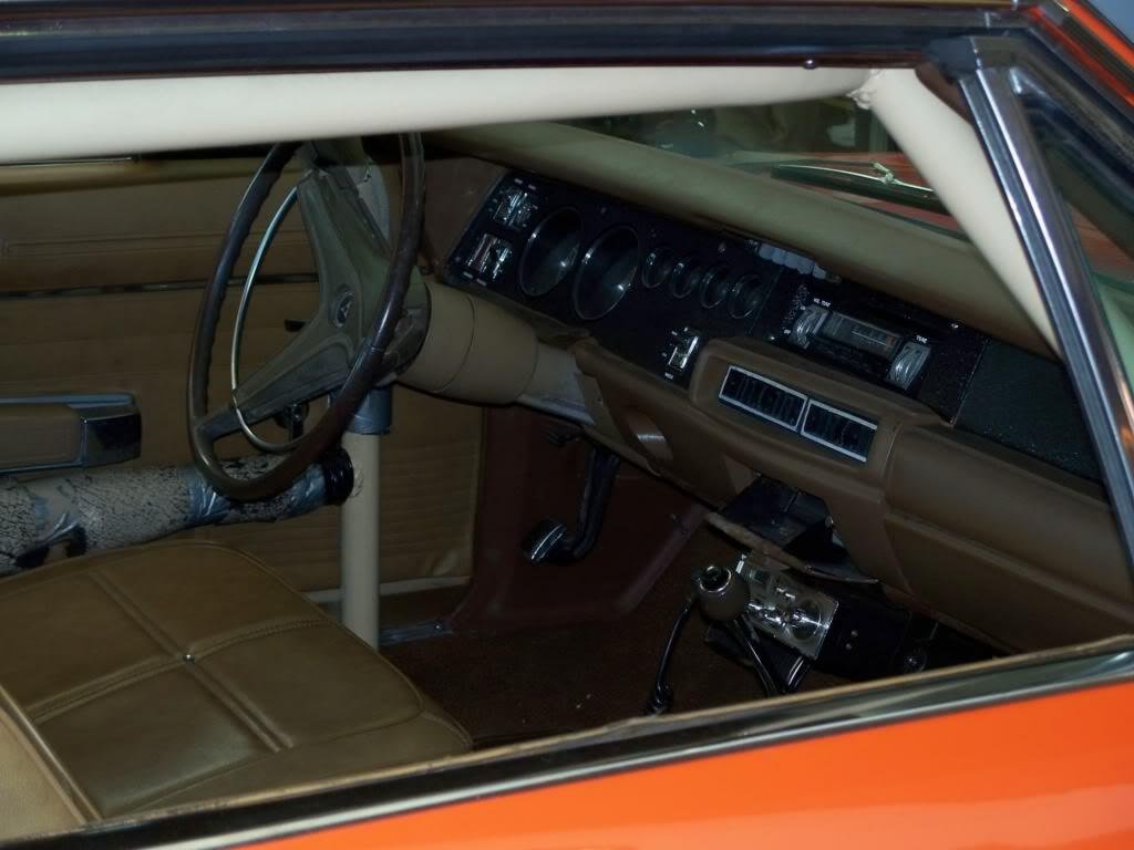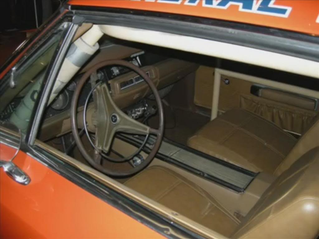 General Lee #1 featured a three-speaker dash and the standard tan colored steering wheel with the padded center and partial horn ring. The front bucket seats did not have head rests. The back seat was removed for the roll cage since Lee #1 was a second unit stunt car but the rest of the interior stayed intact. Other General Lees including many later ones had the backseat as the Duke boys had passengers in the rear in a lot of episodes so a full roll cage was not used for the cars used in these scenes. The door lock pins were removed to allow the actors to slide in and out of the window smoothly without catching anything.