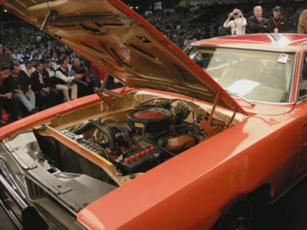 When the team did the restoration on Lee #1 a number of years back, they decided to make the engine look like it would of after ten years of daily use. The block and valve covers wore dirty orange paint that was chipped and cracking and the intake manifold wore dirty Chrysler blue paint. The air cleaner on the restored Lee #1 is the stock black wrinkle finished, unsilenced unit however when the hood is opened in the episode “Repo Men,” you can briefly see a chrome air cleaner sticking up over the radiator support. Please note in that episode, the close up of the modified “Richard Petty” engine wasn’t actually the one in the car.