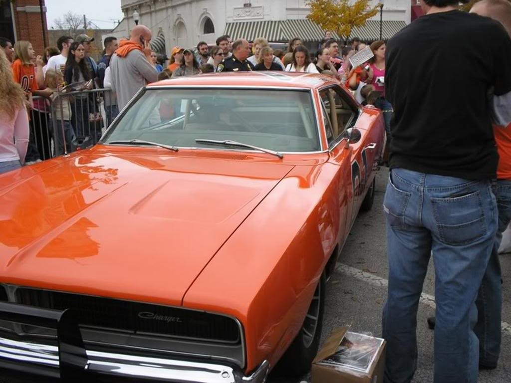 Three 1969 Dodge Chargers were built in California while auditions for the cast were taking place. Initially, the General Lee was painted bright Orange with a Confederate Flag centered on the roof and “GENERAL LEE” text on each side of the roof above the side windows. Once the cast members were finalized, they along with one General Lee and one police car were sent to Griffith Park in Los Angeles, California for a promo publicity photoshoot. At the time, the General Lee did not the now trademark “01″ on the doors and it was not known that the doors were going to be welded shut in the storyline. That’s why you will see the missing “01” and the doors open in many early publicity photos.