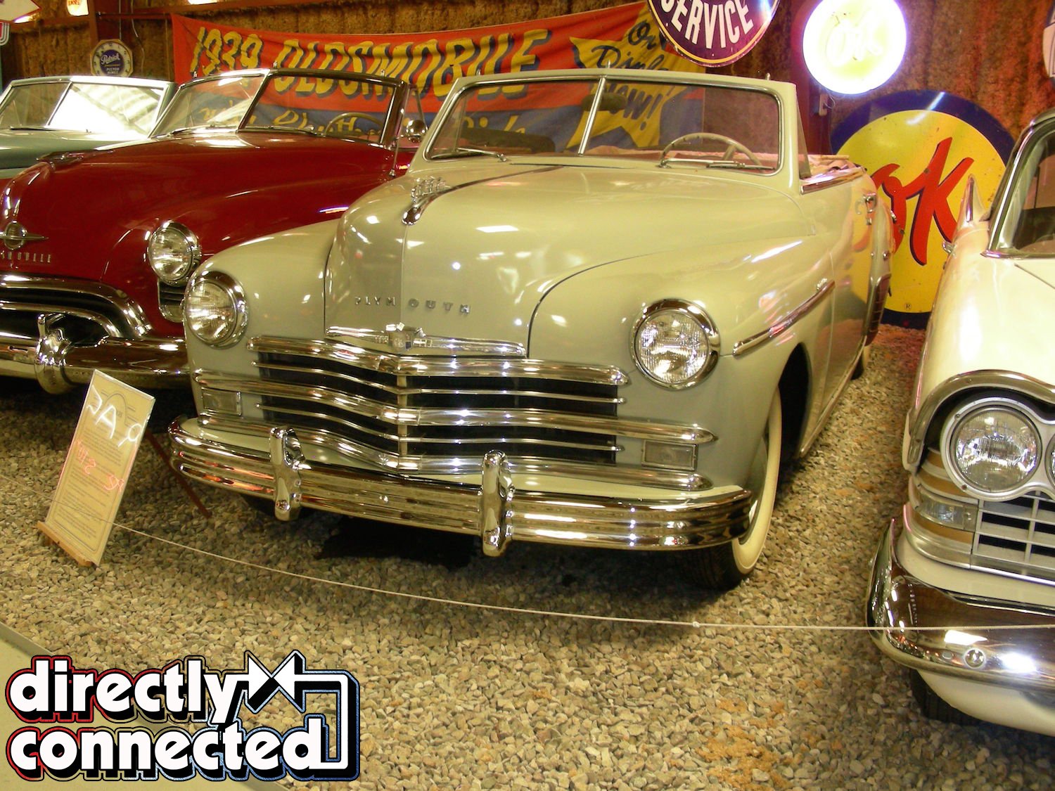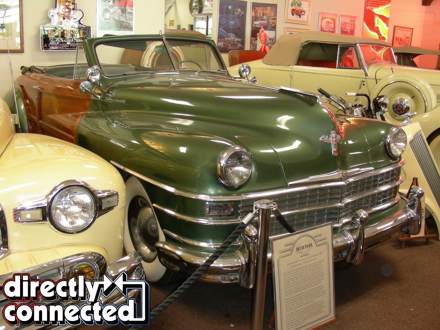Among the great cars in the first building are highly sought after classics, such as a 1931 Chrysler Deluxe 8 Roadster and a 1928 Franklin Boat Tail Roadster along with a 1935 Packard 120, a 1948 Lincoln Continental and a 1948 Chrysler Town and Country, each a convertible and all of them beautiful. Near the back of the building, a trio of Indian motorcycles is displayed next to a rare 1958 King Midget, while other cars, parts and neon signs are displayed in virtually every available inch of floor, wall and ceiling space. Adding interest is memorabilia that is showcased in antique glass cases that crowd the floor.