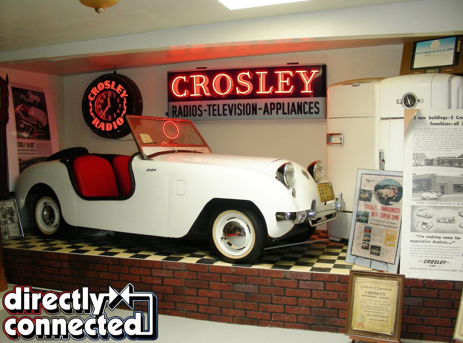 The opposing wall is lined with more vintage cars. At the end of the long aisle, there is a period perfect display that showcases a radio, television, refrigerator and automobile, each of which were manufactured by Crosley, along with advertising promoting these products to consumers. Turning the corner takes you down yet another aisle, with more neatly displayed convertibles representing numerous manufacturers, in an endless array of colors and models. Adding interest are antique gas pumps, dealership promotional materials, and just about anything else you can imagine connected with an age when prosperity in America seemed like it would never end.