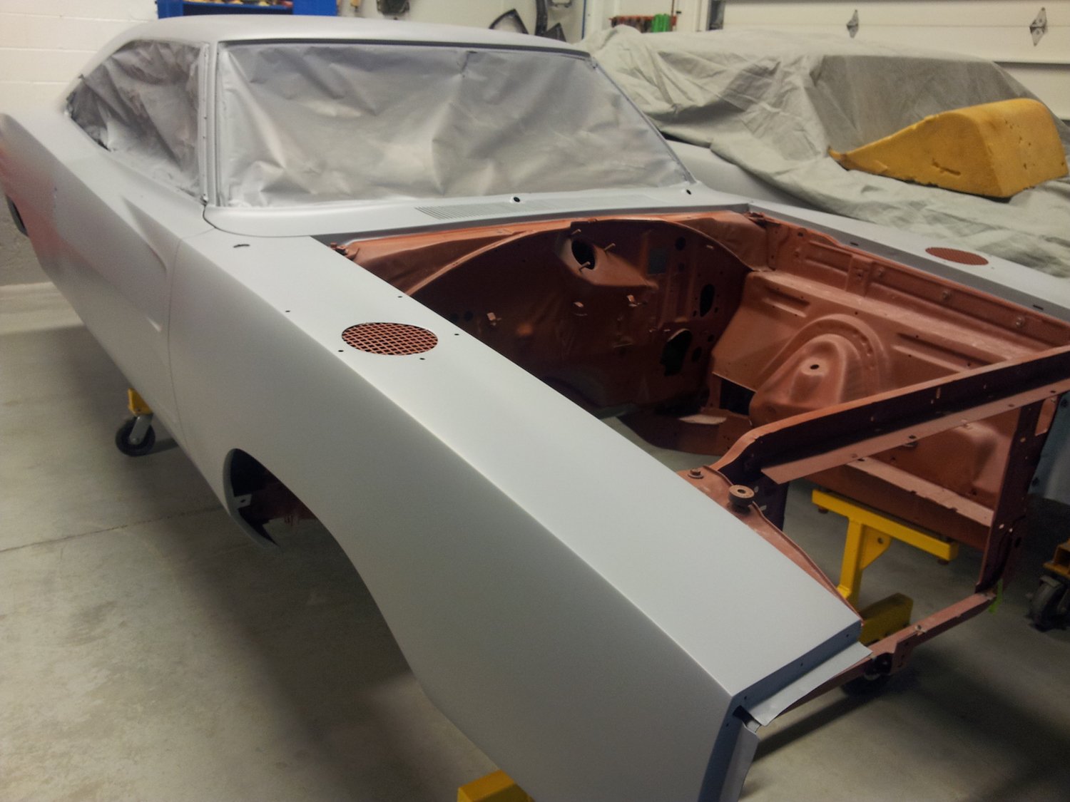 “We can confirm all the windows were out when the Mod Top was installed. This was done at Creative Industries prior to the window clips being installed that hold the window trim on around both front and back windows. A special headliner needed to be installed in all Daytona’s right after the rear window plug was installed. Installation of this headliner required the windows to be out and we know this was done while at Creative Industries. During the restoration we have found Mod Top material behind the window clips and in places it could only have been placed when the car was being converted into a Daytona.”