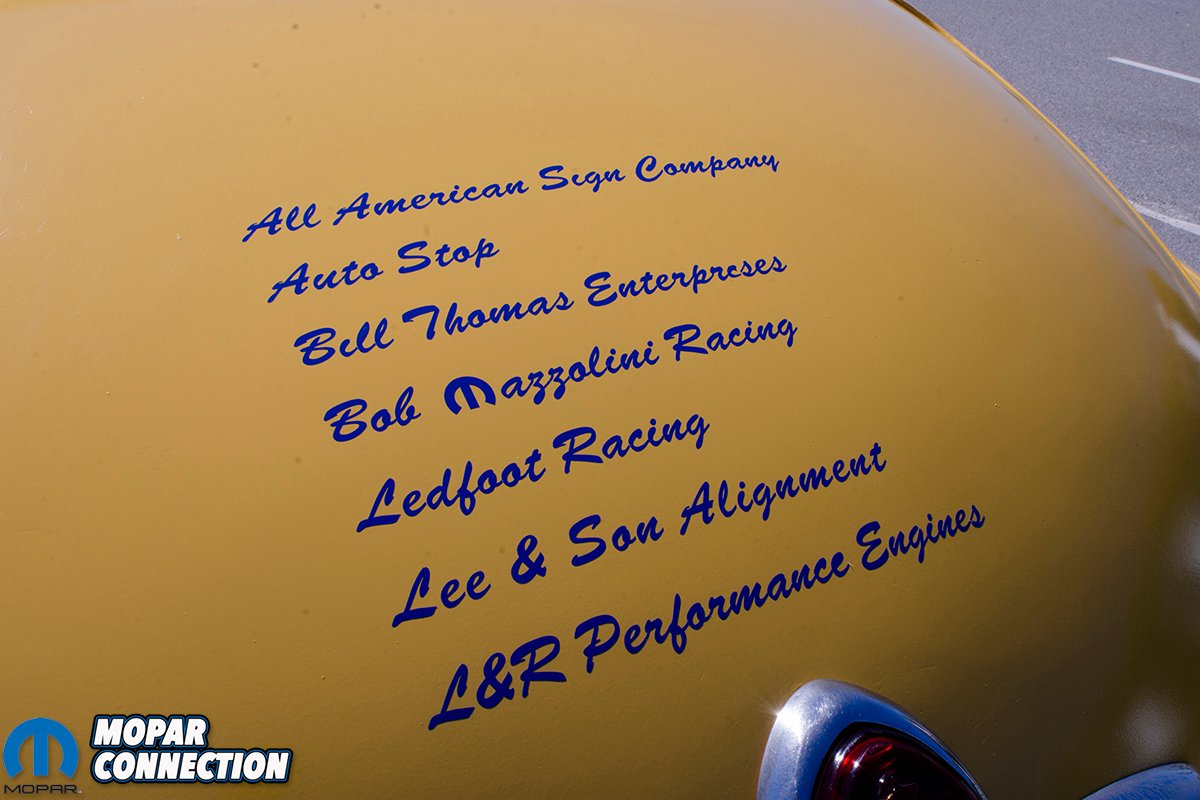 A roll bar would replace the rear seats. The driver’s seat was usually switched out for a racing bucket, and the seat belts were taken out, and exchanged with aircraft seatbelts, purchased from an Army surplus store. The stock engine was replaced with a much larger Chrysler 392 Hemi, or even a Dodge 413 V8, with added headers. The rear end was swapped, in order for the car to wear larger racing slicks in the back, but the front tires were very skinny. These cars ran on normal pump gas, which gave them the nickname of what was known as a “gasser”.
