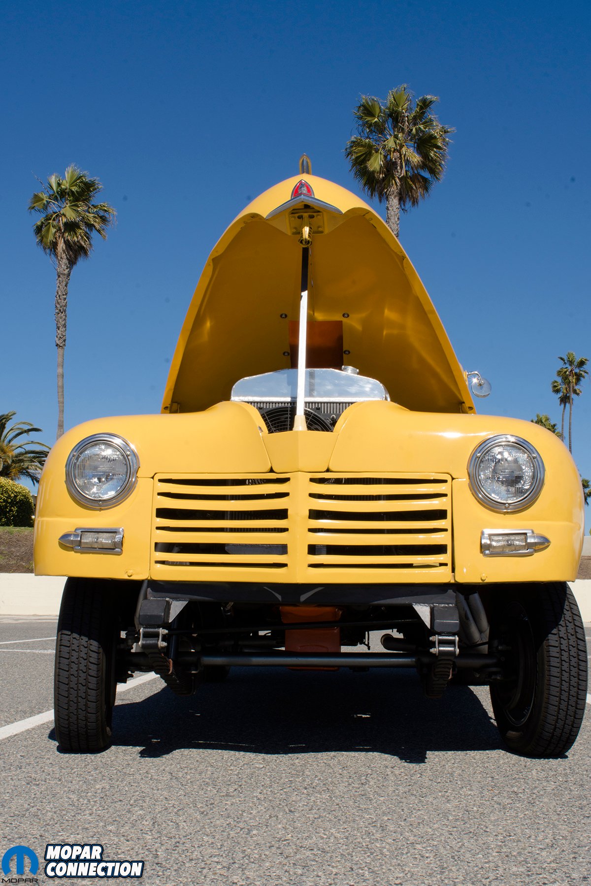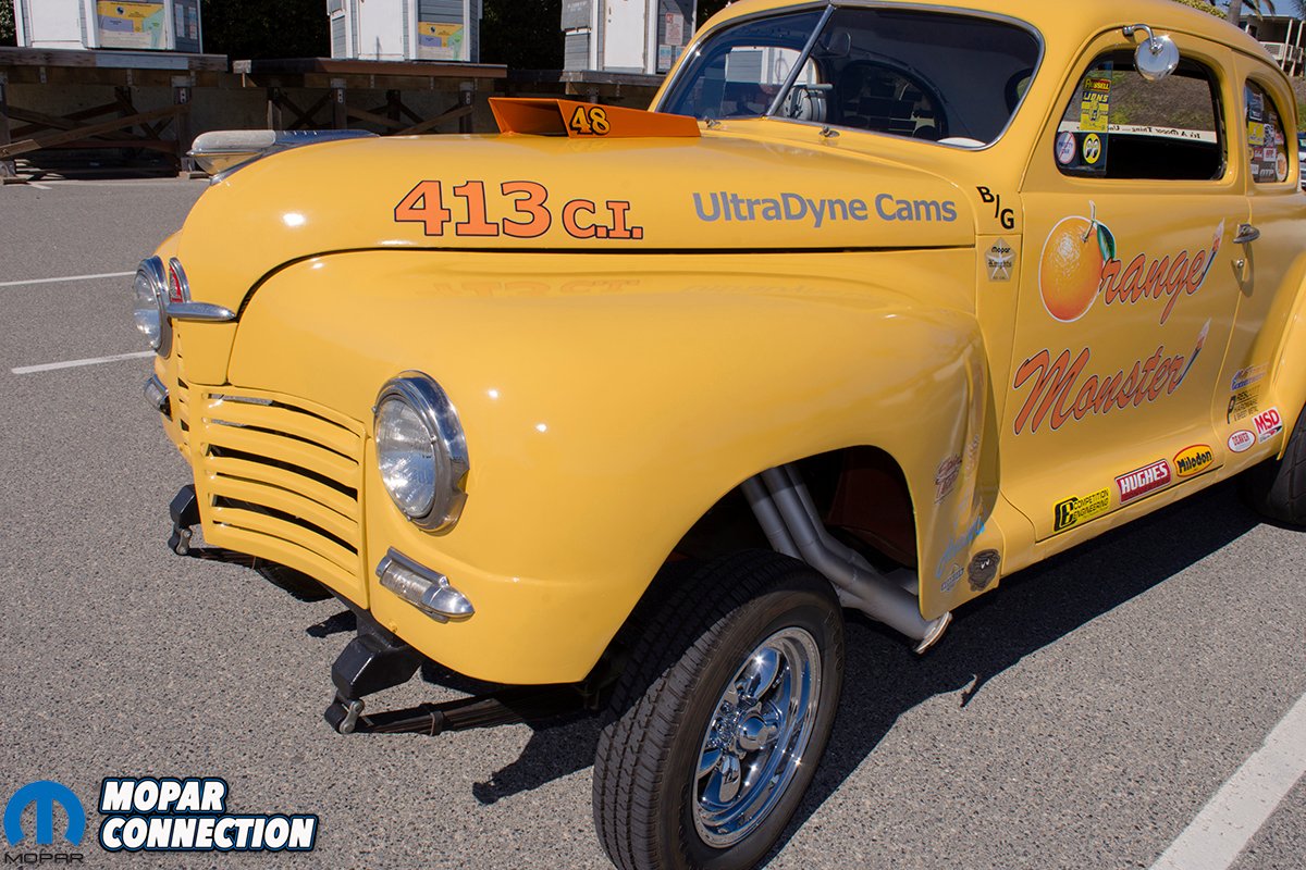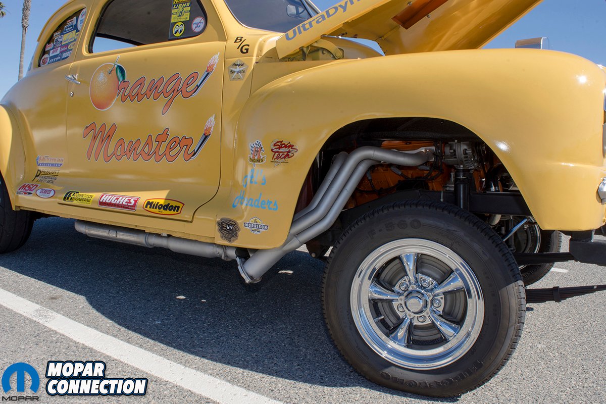 Larry Dewees of Cypress, CA has a ’48 Plymouth gasser that invokes the spirit of the 1960’s Gasser Wars. Dubbed the “Orange Monster,” Dewees’ Plymouth is fitted with a Max Wedge 413 V8 out of a 1965 Plymouth. Dewees started off with a ’48 Plymouth Special Deluxe, and turned it into something that could have been seen screaming down the 1⁄4 mile stretch at Lions Drag Strip, which was a huge staple of drag racing from 1955 to 1972.