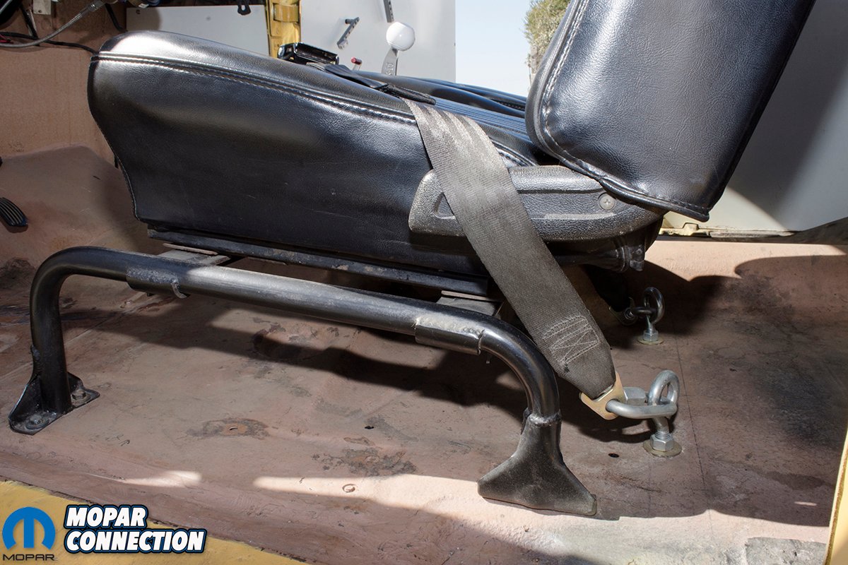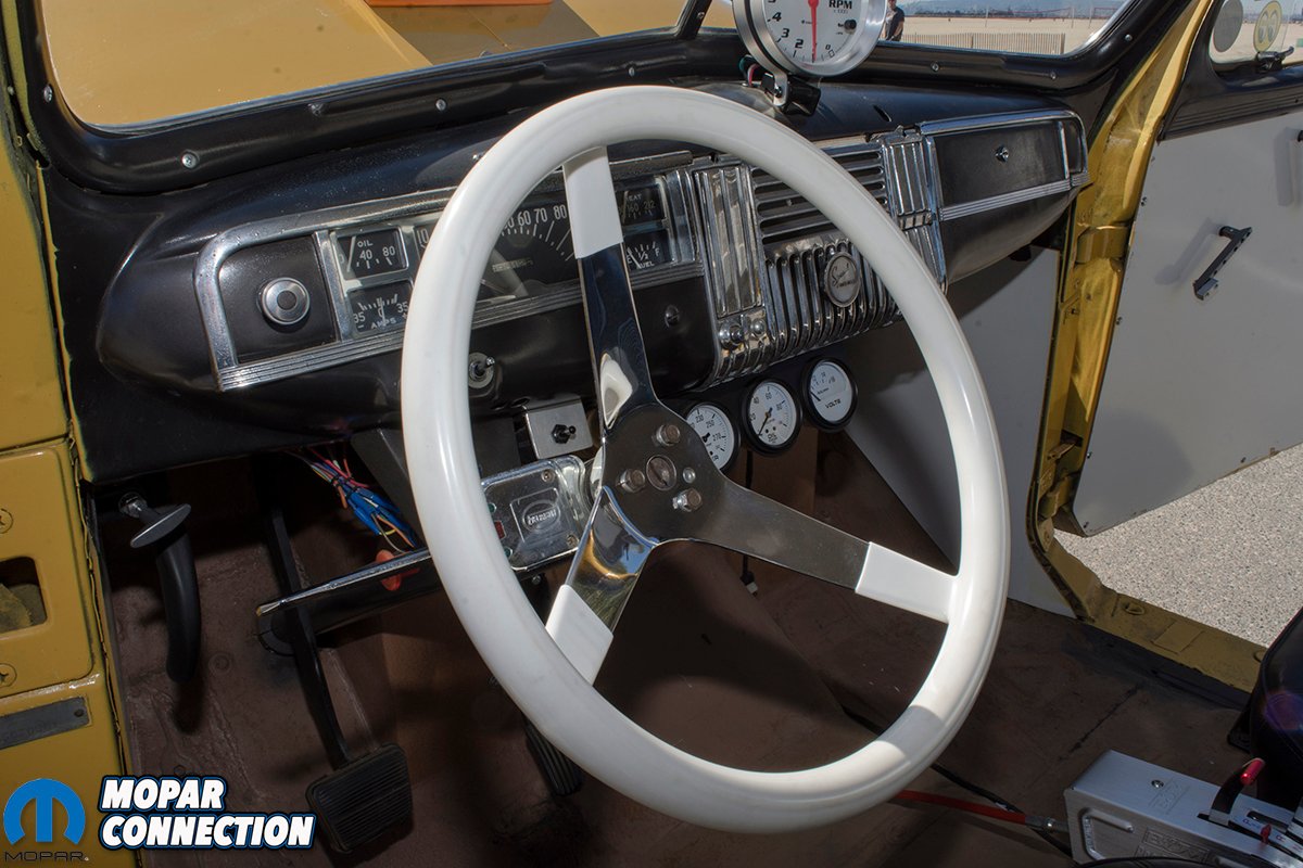 Like a traditional gasser, the interior was gutted. The seats were replaced with bucket seats, which are believed to have been from a Ford Mustang. Seat belts are stock seat belts, opposed to the military style aircraft belts that were originally used. The stock steering wheel was replaced with a white vintage-style steering wheel that can also be removed. Dewees opted to leave the original dashboard, and the original gauges still work. Add-ons include an aftermarket tachometer, mounted on the dash, and additional gauges for water temperature, oil pressure, and voltage are mounted underneath the dashboard.
