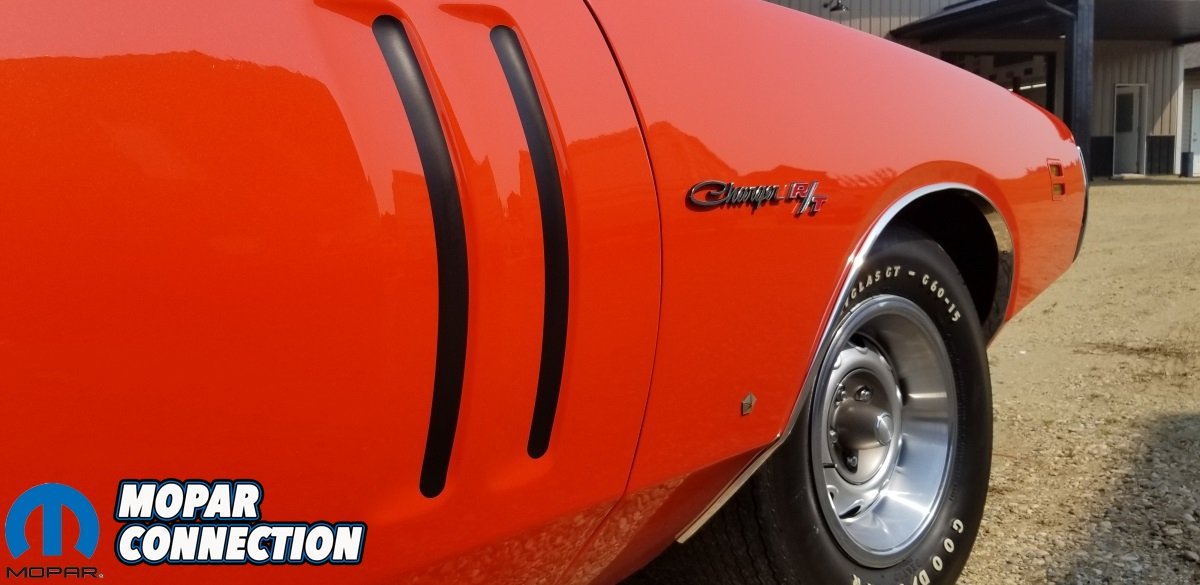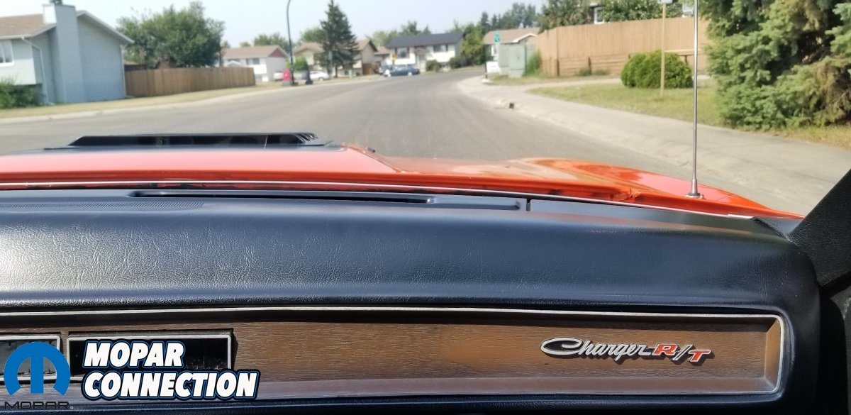 The interior was redone by Arlo’s Interiors with the only new parts needed being a carpet kit, headliner and seat bottoms which were sourced from Year One. A new vinyl top was installed by Arlo’s Interiors as well and the stripes were installed by Rick Leite from Western Auto Graphics. All of the other work you see was done by Kori’s talented hands. Since completing the restoration in 1996, Kori has moved on from his technician job at Southside Chrysler and opened his open shop, Show & Go Restorations where he has turned out some absolutely amazing award winning Mopar restorations. Even though he has worked on hundreds of old Mopars over the years, his orange Charger will always hold a special place in his heart. Kori even had Robin McQueen over at Automolove.ca design an awesome banner of the car which proudly hangs on the wall next to it!”