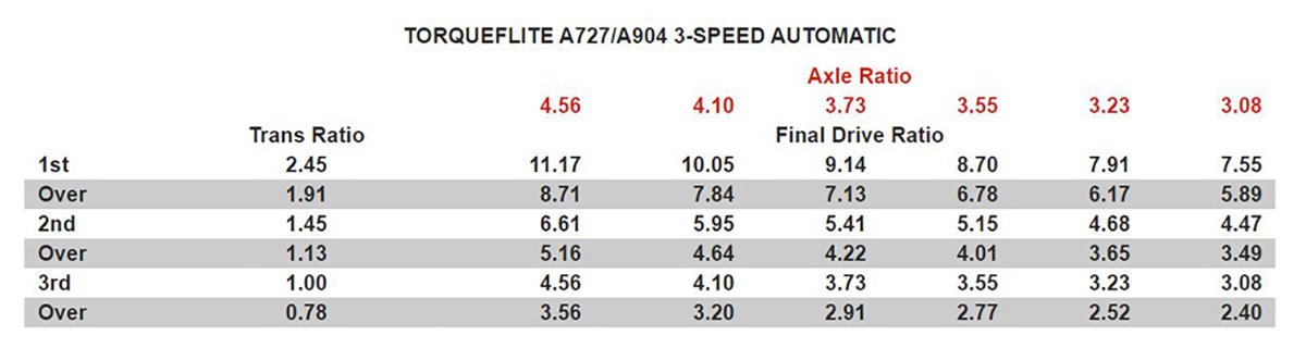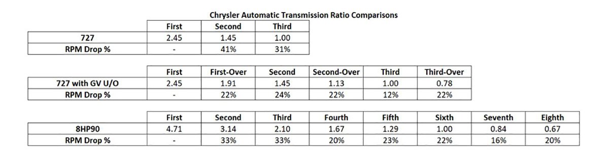 Think about the 840-horsepower Dodge Demon; there’s a reason it’s so fast with the 8HP90 eight-speed automatic. With such tight ratio spacing, the Demon is able to stay near maximum torque production at all times. None of the gear steps are so drastic that they cause a lug. Rather, each gear feels like another rocket blast of power. Once the 8HP90 is through its two lower “granny” gears, the highest percentage drop between gears is a manageable 23%. A 727 with a GV U/O is very similar, as the highest percentage drop being 24%. Add in the fact that a rebuild kit for a 727 is cheaper than a fluid change in an 8HP70 or 8HP90, it’s easy to see why a GV-equipped 727 makes the most sense behind a modern Hemi swap.