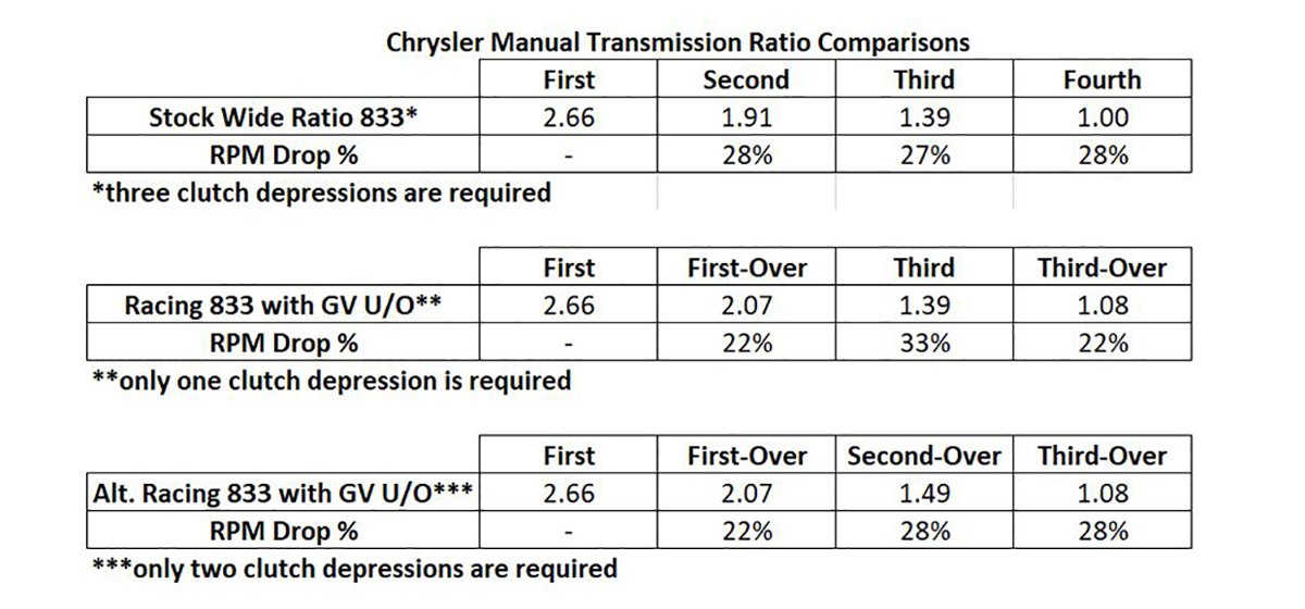 Without a GV U/O, the RPM drop from first to second is so large that some cars don’t have enough power to keep the wheels spinning in second. This is exactly what you see in the hundreds of homemade videos where someone is showing off, then hooks hard into an embankment, another car, or a ditch. The GV U/O could have potentially saved them some embarrassment with first-over providing enough torque multiplication to ease the transition.