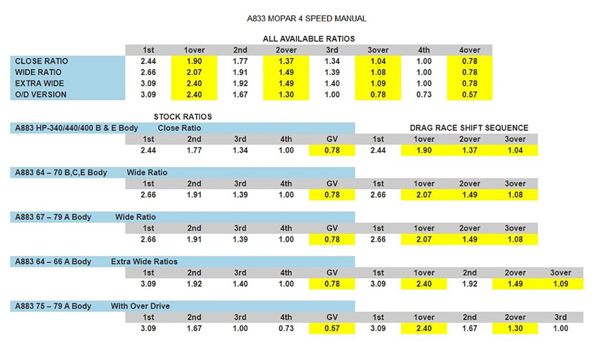 Let’s start with what gear splitting looks like behind the four-geared A833. Long regarded as one of the most bullet-proof stick shift boxes, an A833 is generally only replaced when an owner decides it’s time to go through the trouble and expense of an aftermarket 5-speed or 6-speed. But that should really never happen with a GV U/O available. “The Chrysler A833 4-speed is one of the best shifting, most durable transmissions built. We cringe whenever we hear someone switched one out to a lightweight late model 5-speed,” says GV. Aside from the hassle of requiring a new bellhousing, flywheel, clutch, shifter, and crossmember; an aftermarket transmission is missing one huge feature of a GV-equipped A833: gear splitting.