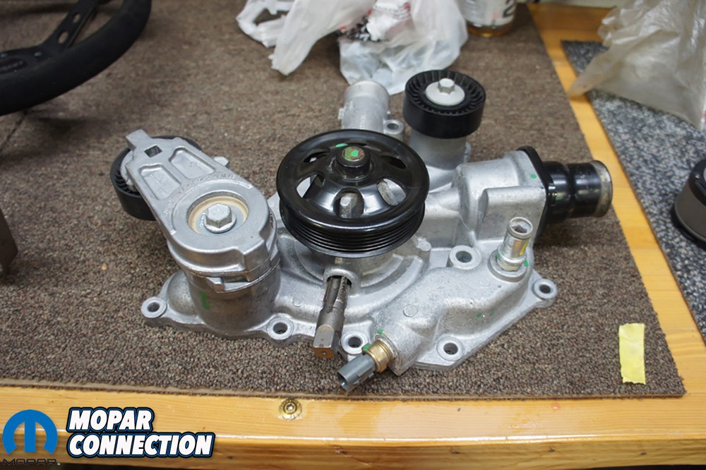 The last piece of the puzzle was finding a proper size serpentine belt. We had a couple laying around and one happened to fit. This particular one came off a 5.7 Hemi, part number 53013676AC, and fit our accessories perfectly. With the belt on, we filled fluids and connected our Yellow Top Optima battery.