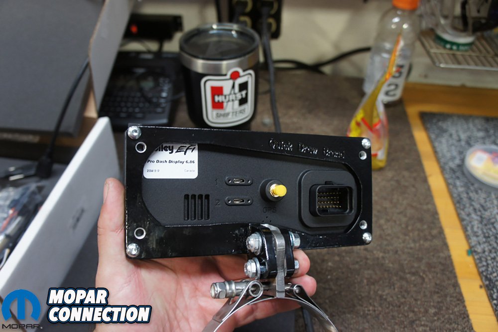 Above Left: We needed a solution for our Holley Pro Dash 6.86″ and Quick Draw Brand had a universal mounting solution that we were able to attach to the steering column. Above Center: The bracket still allowed access to all the ports on the back of the Holley Pro Dash. Above Right: We laid out the Pro Dash connections and made sure everything was wired correctly.