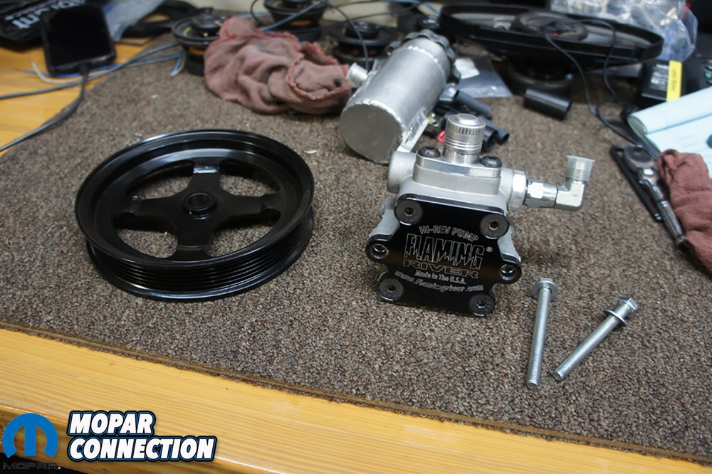 Now that we were done with being under the car, we were off to finish a few pieces and get the motor fired up. Next on our list was getting our Flaming River Hi-Rev power steering pump mounted. We found out that Quick Draw Brand had a bracket for a GM type II pump to properly fit our 392 Hemi. The bracket worked perfectly and our pump bolted on like factory. We used a Holley 97-152 pulley to give us a little over a 1:1 ratio with the crank pulley We later found out that at low idle this pulley was a little too big and might try a smaller pulley. The good with a pulley being a little big is that at high RPMs the pump will not over-rev.