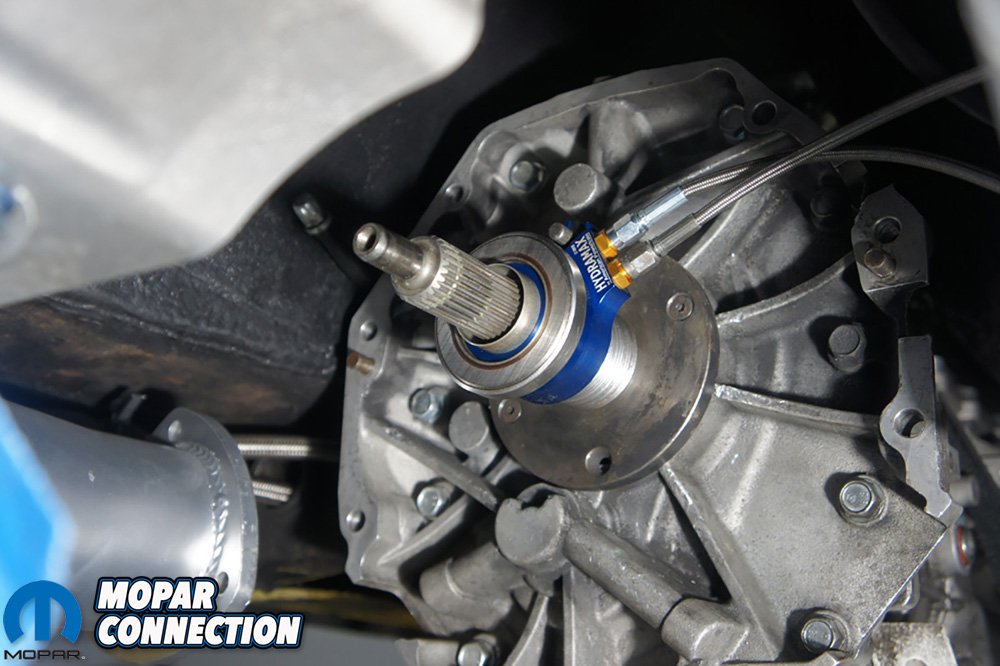Above Left: Lifting the off and back down on the drivetrain is much easier than pulling the wide Hemi through the top of the engine bay. Above Right: With the American Powertrain Magnum T-56 out we measured for our Hydramax throw-out bearing.
