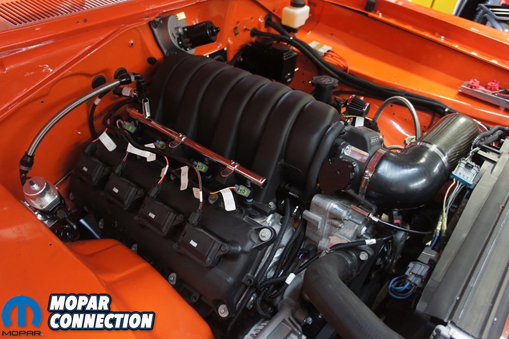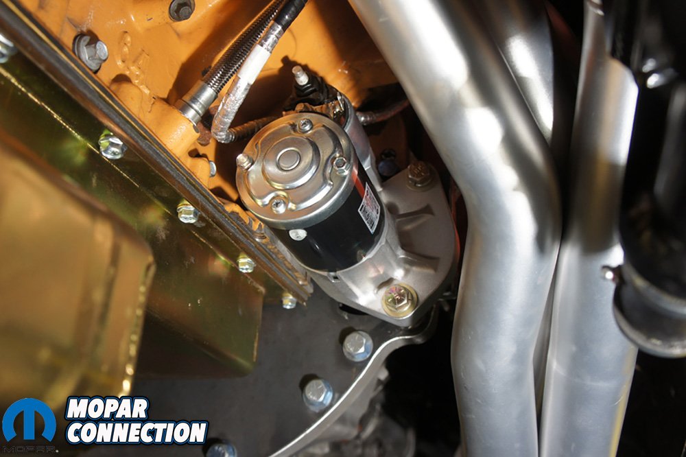 In the cooling department we threw a Stant 180-degree thermostat in the motor. The factory thermostat is 203 degrees and way hotter than what we need. We also mounted a factory 2016 Challenger SRT-8 radiator and fans for the time being. The factory Hemi radiator took some ingenuity to get mounted and we are working on finding a better solution for the swap.