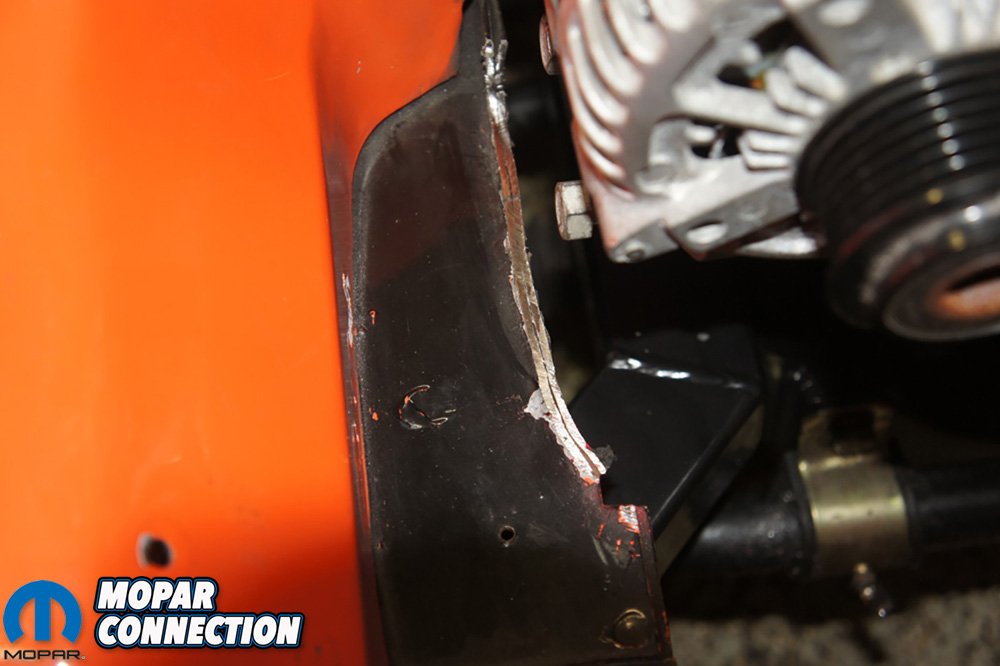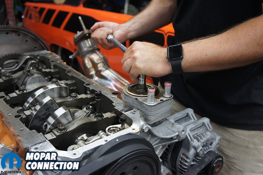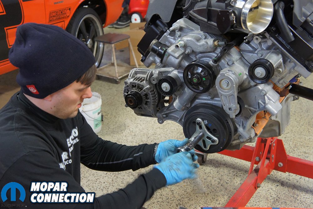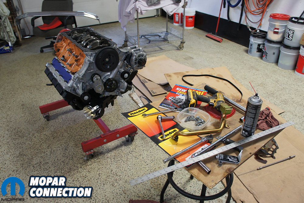 Before we dropped the engine down in Project Orange Crush, we had some work to do on the 392. We started by stripping off the parts we did not need like the wiring harness, throttle body, A/C compressor, power steering delete pulley, exhaust manifolds, and a couple other things.