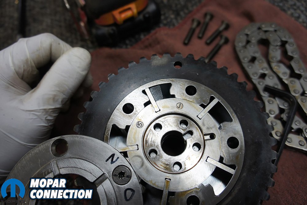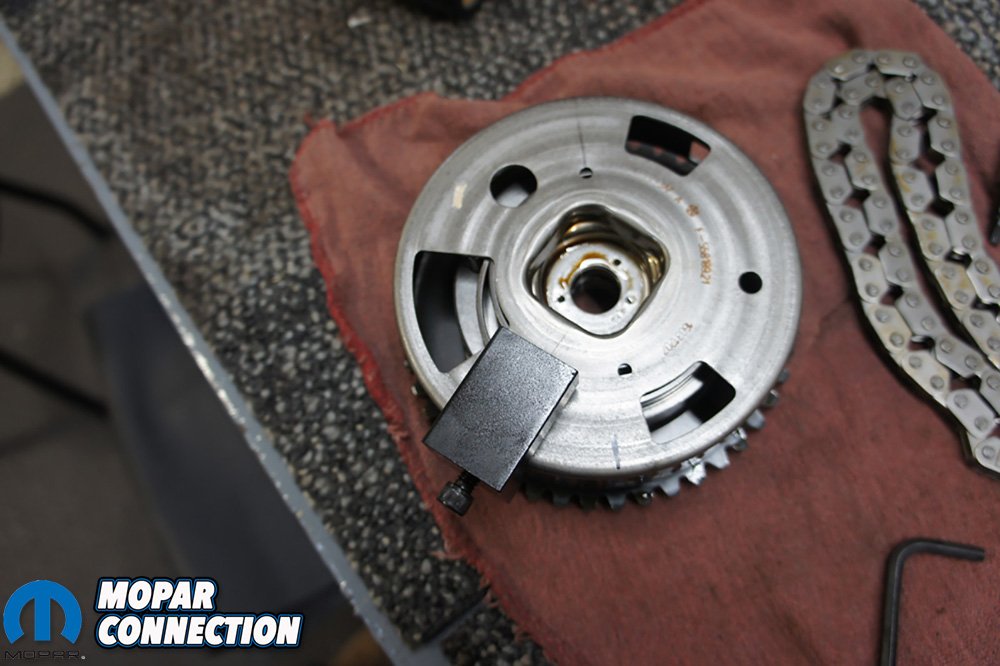 Above Left: We needed to dive into the front of the motor to lockout out our variable valve timing (VVT) with Comp Cams Phaser Lockout Kit. Above Right: With the timing cover off we had access to the cam phaser bolted on the front of the cam. We did have to pull the oil pump off and use a paper clip to take tension off the timing chain.