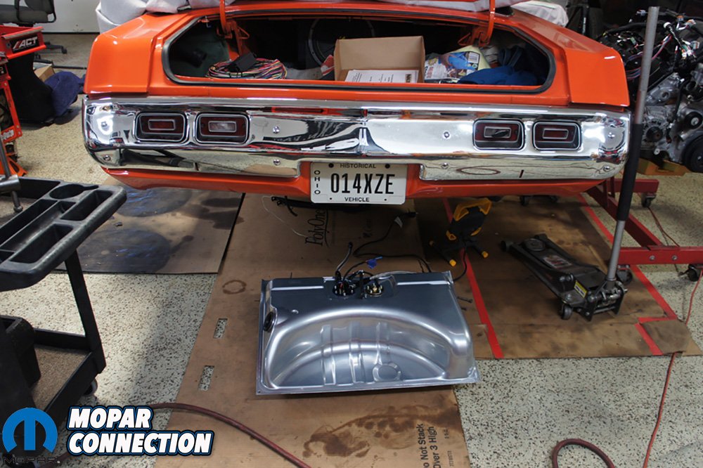 Above: We installed the pump and sending unit in the Holley Sniper EFI tank and was ready to mount it in the car. Above Right: The Sniper tank fit perfectly without any issues and gave us little more clearance from the backside of the 8.75 rear end since the lines come out from the top.