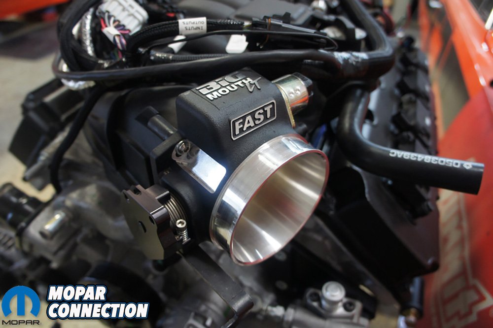 With the motor stripped down to bare bones, we started installing parts we needed for the swap. We began with bolting on the F.A.S.T. Big Mouth XT cable driven 87mm throttle body. This thing engulfs the puny factory throttle body. We did not want to mess with a DBW (drive by wire) throttle pedal. Plus our Holley Terminator X does not support the DBW pedal. The Terminator X Max does, but we just went with the regular X version.