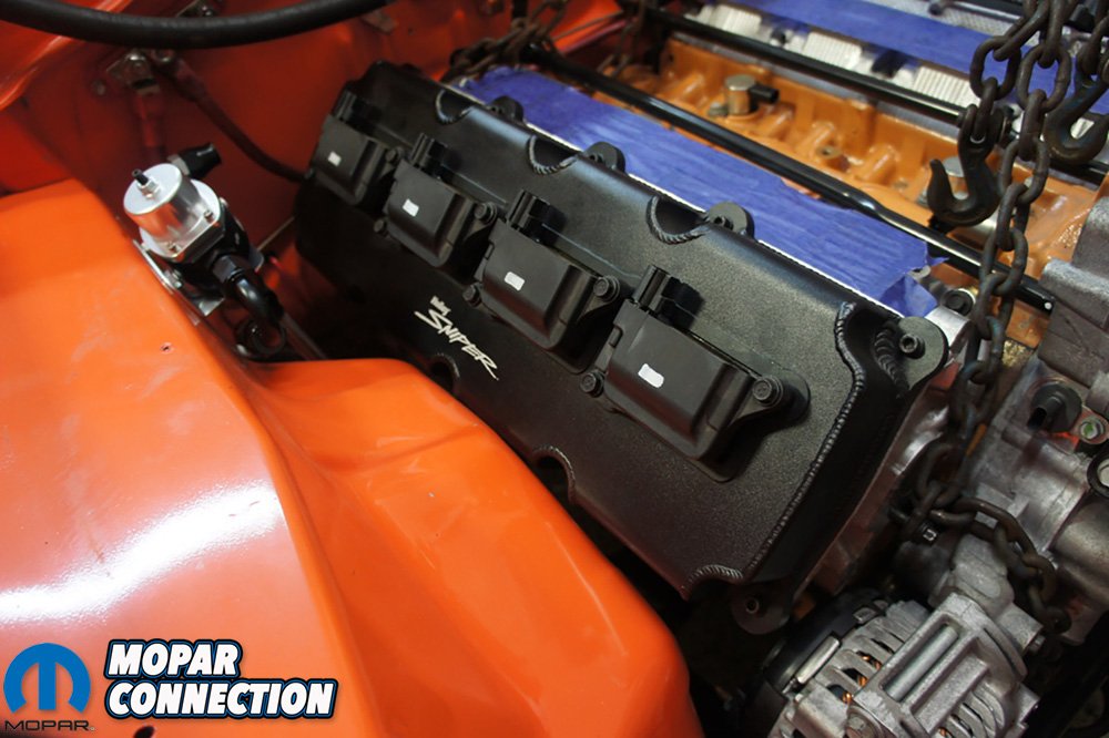 Above Left: It was time to drop the 392 Hemi down into the engine bay. Above Right: We were unsuccessful our first try as the Holley Sniper valve covers hit the inner fender and did not want to clearance the inner fender to make it fit. We swapped to O.E. valve covers to clear the inner fender.