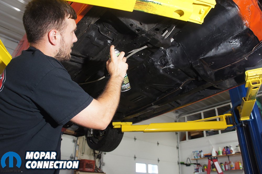 Above Left: We took advantage of the drivetrain being out of the car and coated some spots with DEI Sprayable Boom Mat to help with interior sound and heat from the road and exhaust. Above Center: Before we dropped the motor in we removed the factory oil cooler. Above Right: To remove the cooler you need a 12mm hex.