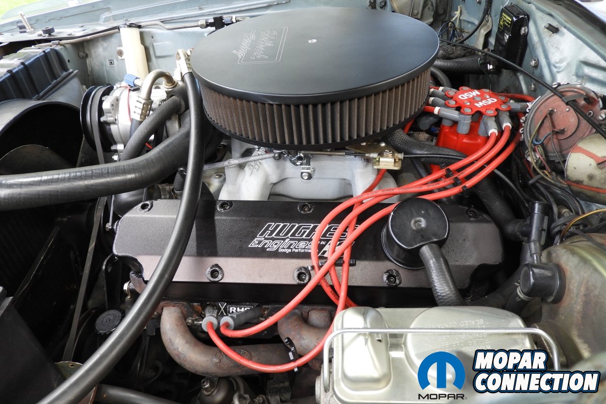 With the appearance of the Charger looking just right, it was finally time for Darrell to consider replacing the tired old 318/904 combination. To give the Charger more go, Darrell decided to go with a 5.9L Magnum built to appear very close to what an original small block would have looked like. A block from a 1995 truck was acquired then reworked, including a 0.04” over-sized bore. The block was filled in and finished out with parts all coming from Hughes Engines such as KB pistons, a Hughes .544” lift cam, 1.6” roller lifters and roller rockers. An Edelbrock Performer Air-Gap intake, RHS X heads and a Quick Fuel 680 CFM carburetor finished out the business end of the engine.