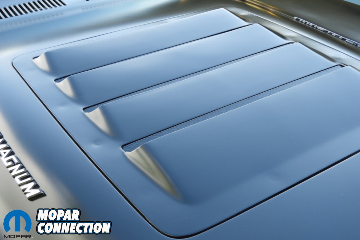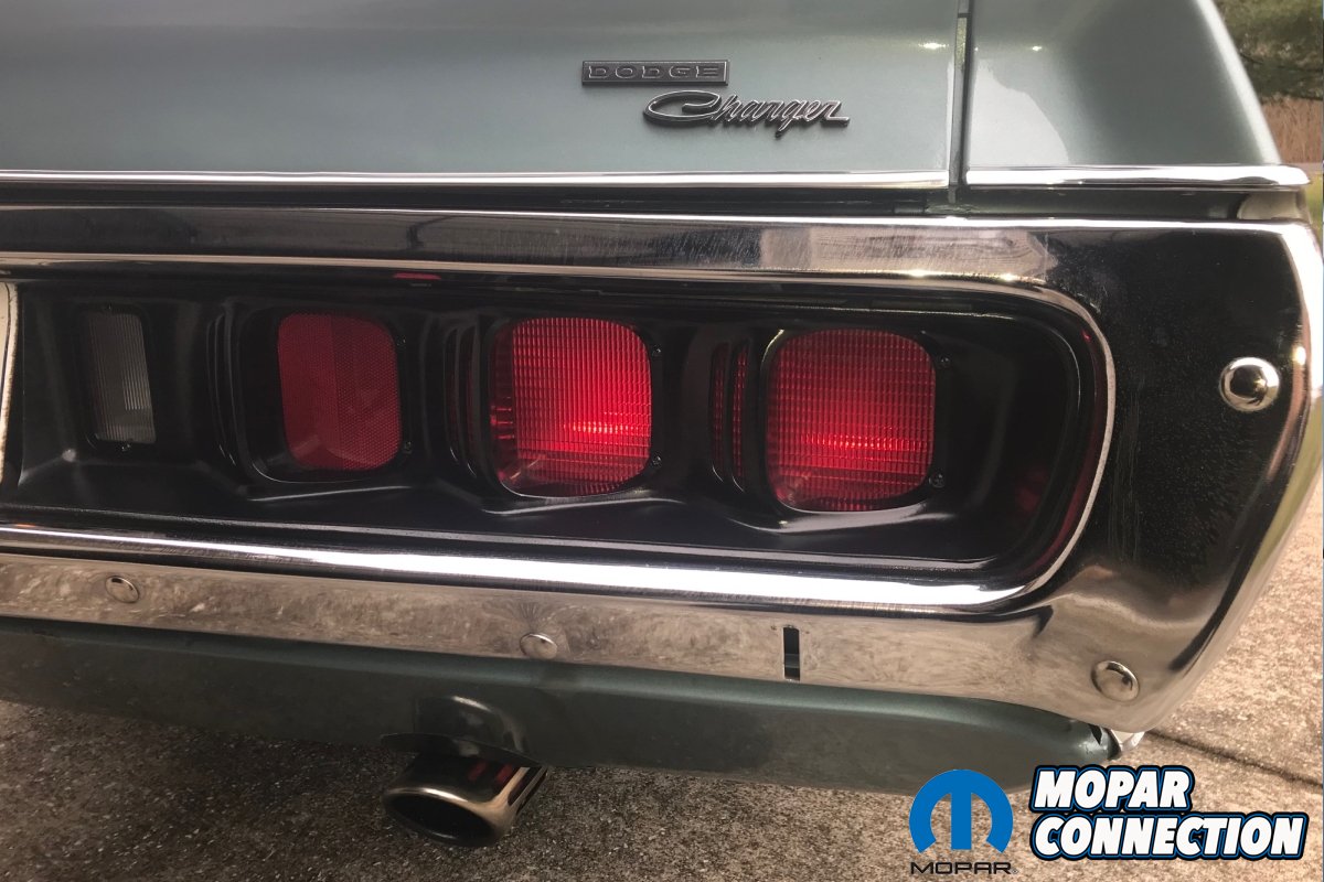To further enhance the exterior of the Charger, an original R/T hood and tail lights were sourced from a 1971 R/T donor car in Canada. The hood was painted satin black and installed with lanyards and the tail lights went in place of the originals. Everything was finished off with a front chin spoiler purchased from Year One.