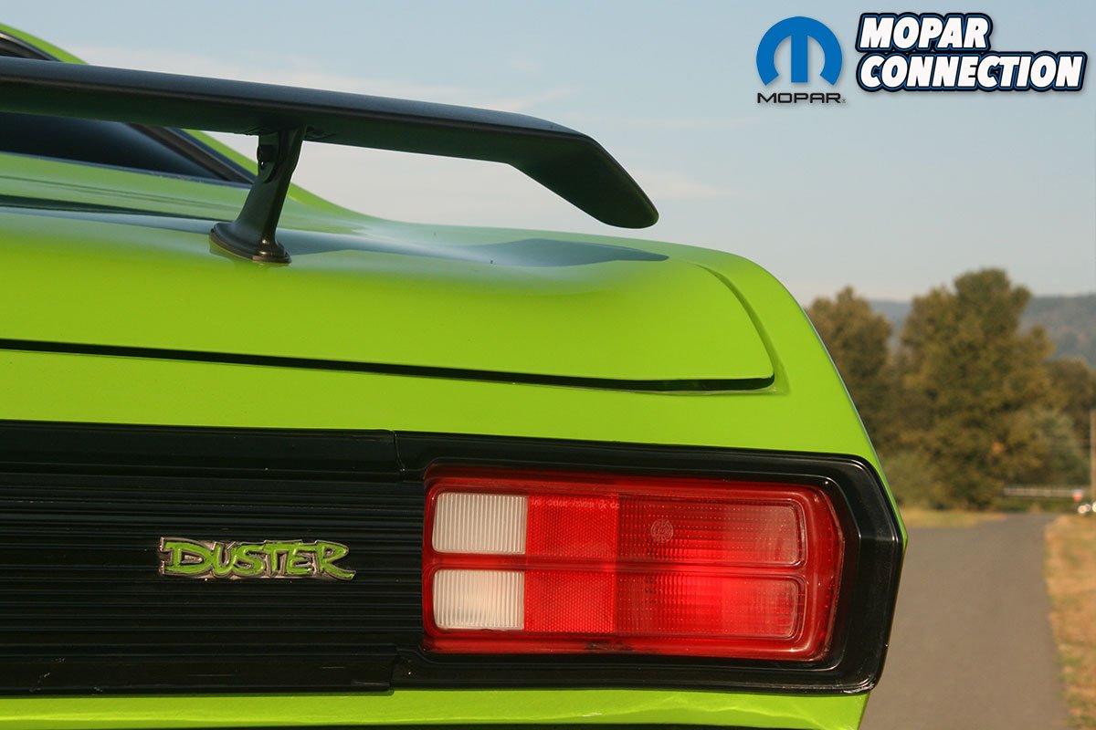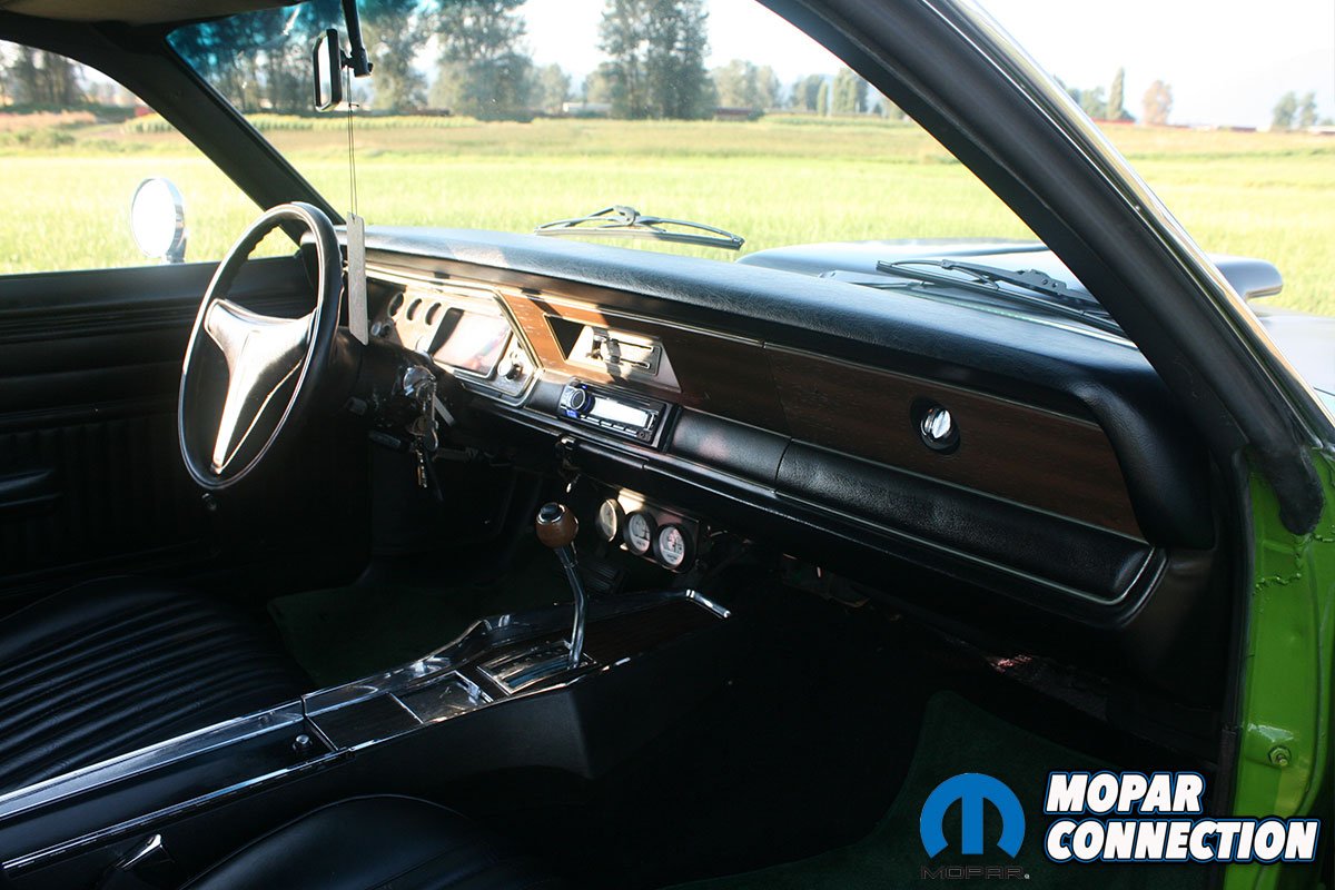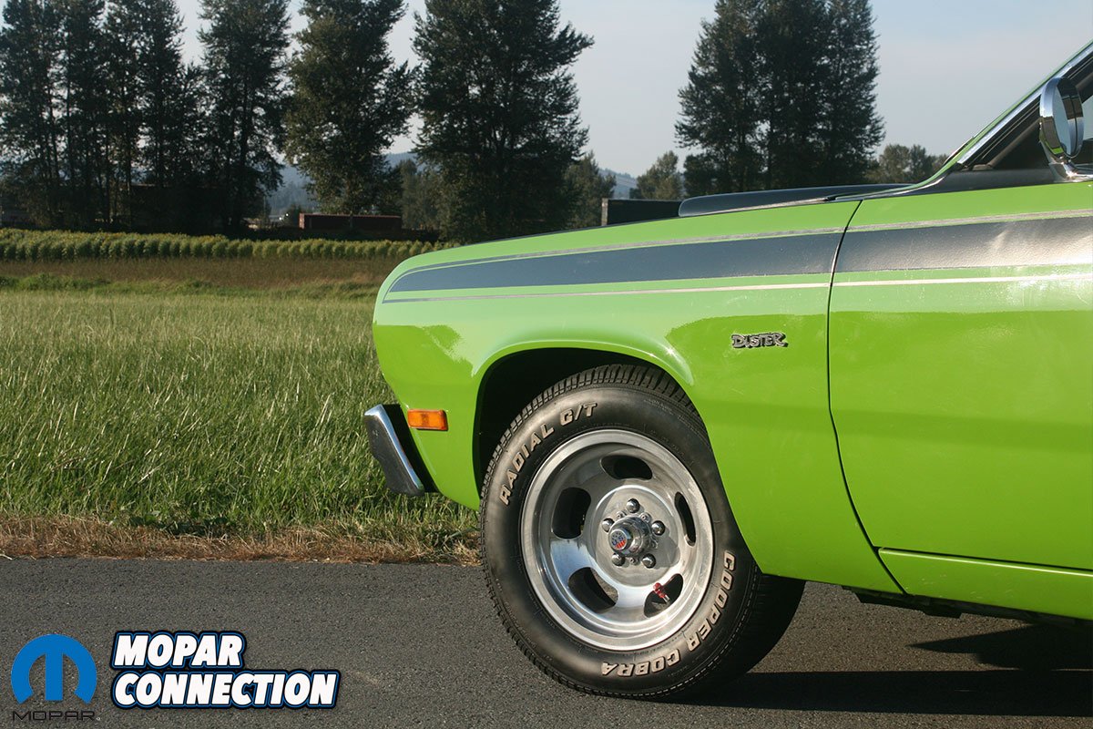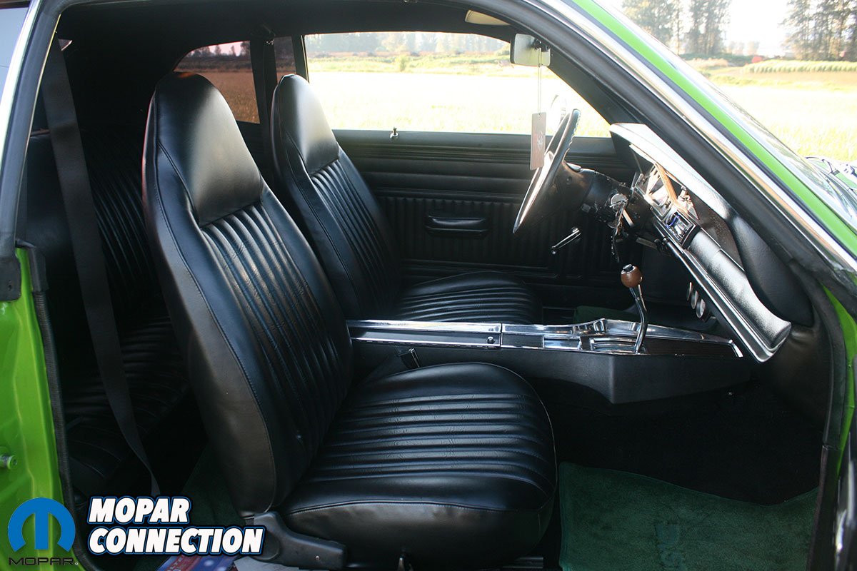 On the inside, the interior was fully restored with fresh black seat upholstery, door panels, dash pad and carpet. Green Duster logo floor mats accent the interior to match the exterior.