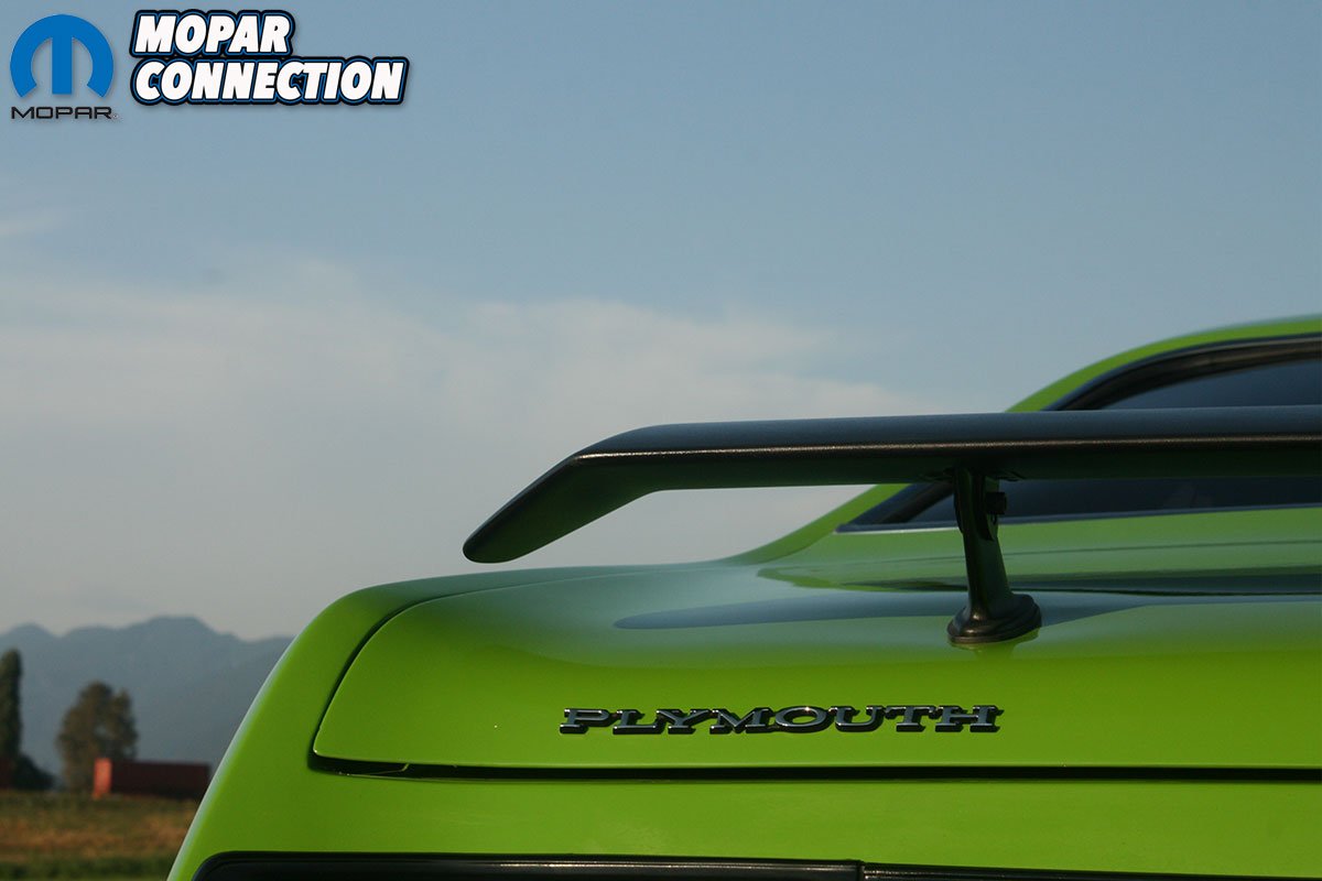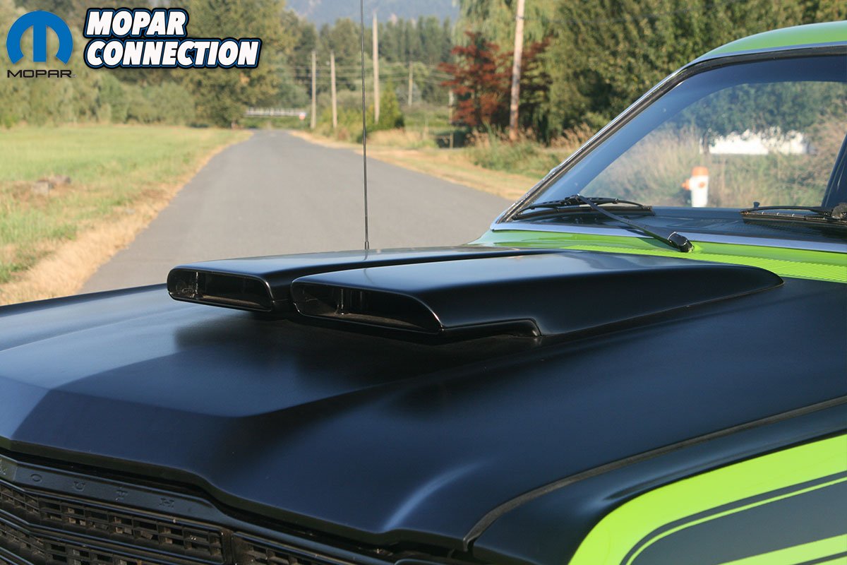 Once the metal work was completed, the car was taken to Julio at Back 40 Restorations in Abbotsford where it was painted Sassy Grass Green with custom 340 style side stripes and the 1971 Duster 340 V24 style hood blackout. Tyson painted the grille and rear tail finish panel black to match the stripes and then hand painted the Duster emblems Sassy Grass Green and black.