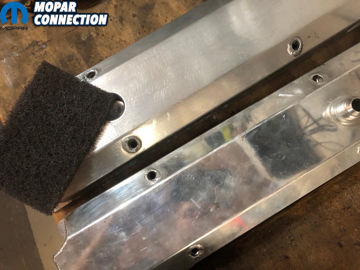 Above left: In another case of “While You’re At It”, I thought now would be a good time to repaint the top end. So off went the top end of the Wicked Wedge of The South. Above center: Before you gasp, “How could you ruin those polished valve covers?!” know that they were already super scratched up and would need to be professionally polished to regain any of their previous luster. Scuffing and painting these, like before, was the easier option. Above right: The heads, valve covers, breather and intake manifold (as well as the valley tray) were coated in several coats in Rustoleum “Hemi Orange.”