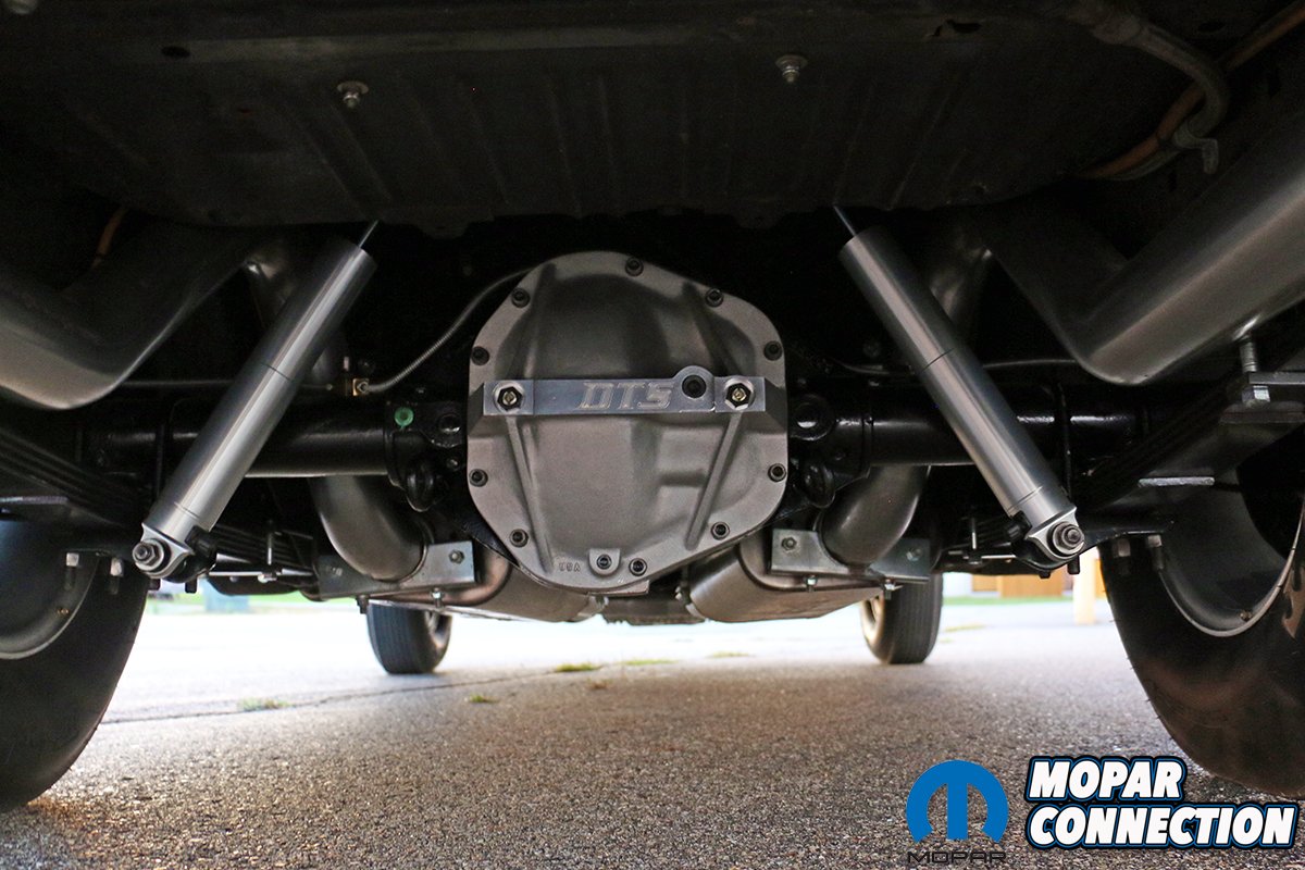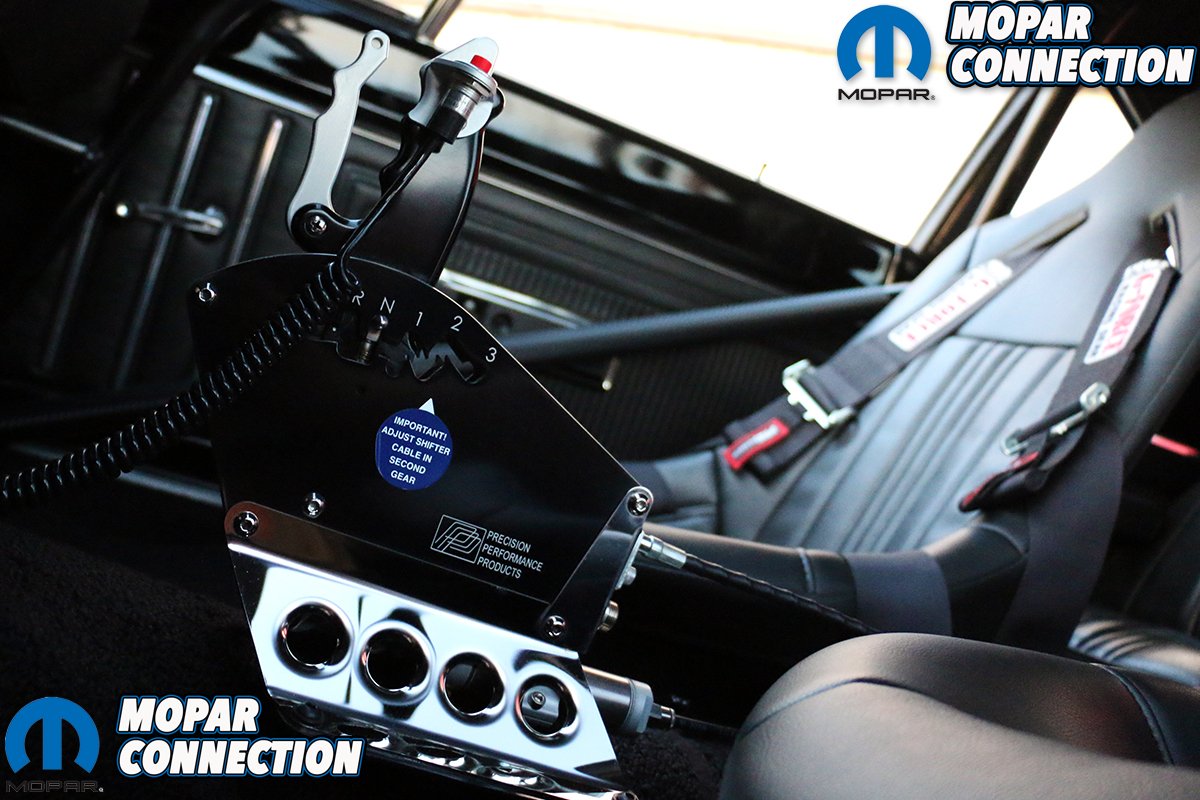 A pair of TTI ceramic coated headers flow into a 3-inch TTI exhaust that has been fitted with Dynomax ultra flow mufflers and exit with factory B-body exhaust tips for an aggressive growl. Backing the 507 stroker is a fully built 727 Torqueflite automatic transmission [yes, it’s no longer a 4 speed -Ed.] that was done by TSI in Elmhurst, Illinois. The 727 was fitted with a “J Type” torque converter with a 4,000 stall, reverse manual valve body and a race flywheel. Shifting is done through a Precision Performance cable linkage that leads to a Precision Performance air shifter. Putting the power to the ground is done by a Dana 60 rear end that has been upgraded with a Strange differential, Richmond 4:10 gears and Moser 35-spline axles.