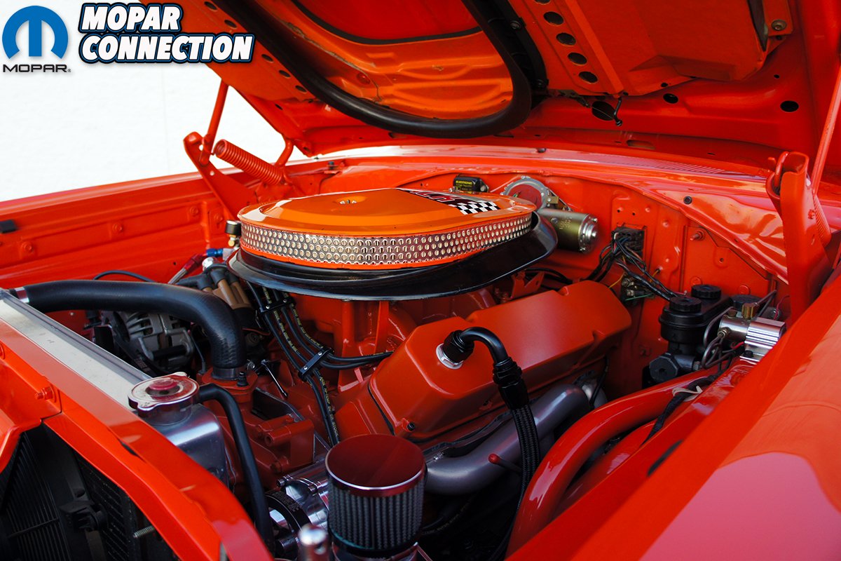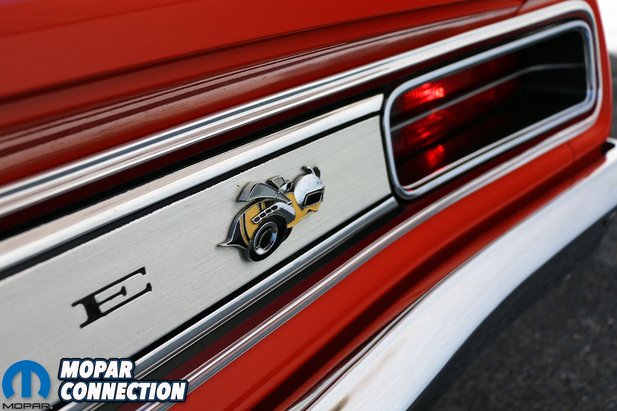 The exterior of the Super Bee is pretty much stock, exactly as Barry wants. It came from the factory wearing EV2 Hemi Orange paint so Barry got it repainted in the exact same color using Dupont paint. Steve Shands Auto Body in Otisville, Michigan did the work and the results are fantastic. The only modification to the exterior was the rear wheel openings were slightly modified in the early 1970s to fit a bigger tire. Barry didn’t see a need with changing it so he left it alone. The ‘Bee wears a black C-stripe proudly as well as features a menacing looking N96 Ramcharger dual snorkel hood.