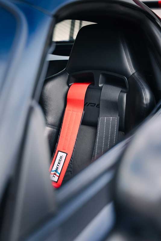 The exterior of the Viper is painted in a beautiful Graphite Metallic Clear with blackout panels and a sharp ACR driver red stripe from bow to stern. The interior is finished in black leather with red and black multi-point seat belts. The ACR package, a $13,558 option, provides plenty of upgrades over the potent base model, including a front splitter spoiler, a rear wing spoiler, unique ACR badging, and competition suspension.