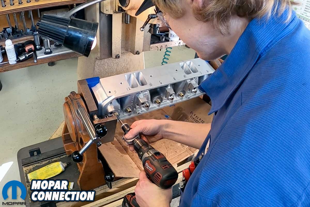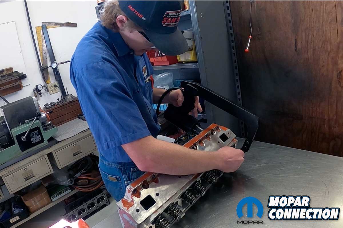 The heads moved again, this time to the porting room. A technician blended the valve job into the bowls of the previous CNC work. A carbide cutter quickly took care of the metal removal. A 60-grit sanding roll followed the cutter to merge the CNC machining to the chamber. Lastly, White used the same 60-grit sanding roll to remove the CNC tooling marks from each combustion chamber. The porting work provided us with beautiful ports and combustion chambers.