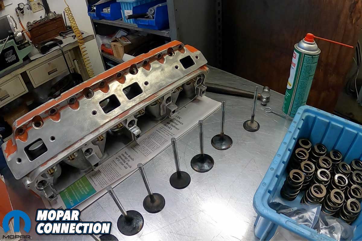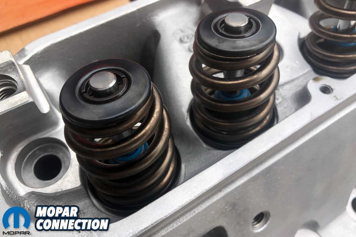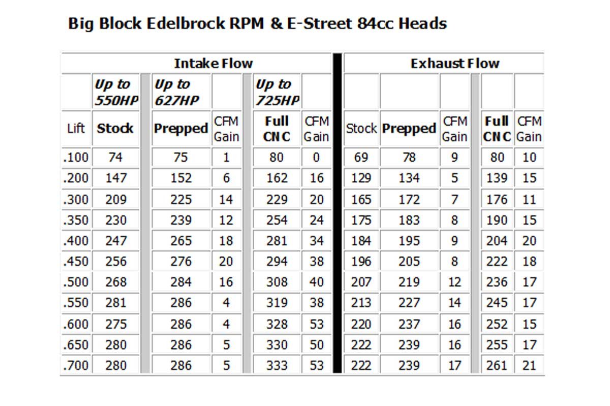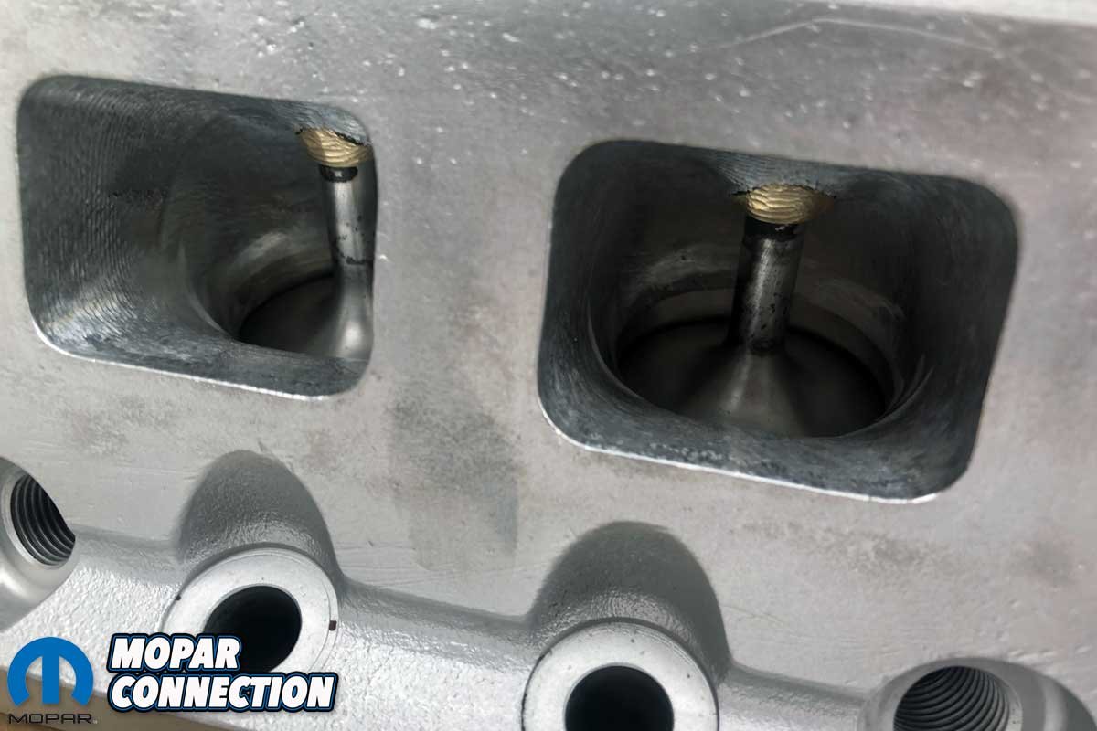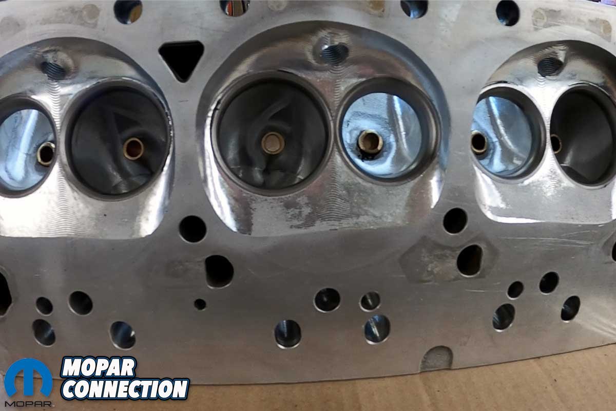 Our Edelbrock heads (part no. 60925) were designed to work on a 1961-79 361-440 CID engine block. The heads had 84 cubic centimeters (cc) combustion chambers and came with a factory flow rating of 281 cfm on the intake at 0.550-inch lift and 222 cfm on the exhaust at 0.650-inch lift. The intake valves measured 2.14-inches, while the exhaust valves were 1.81-inches.
