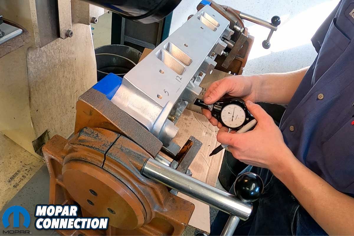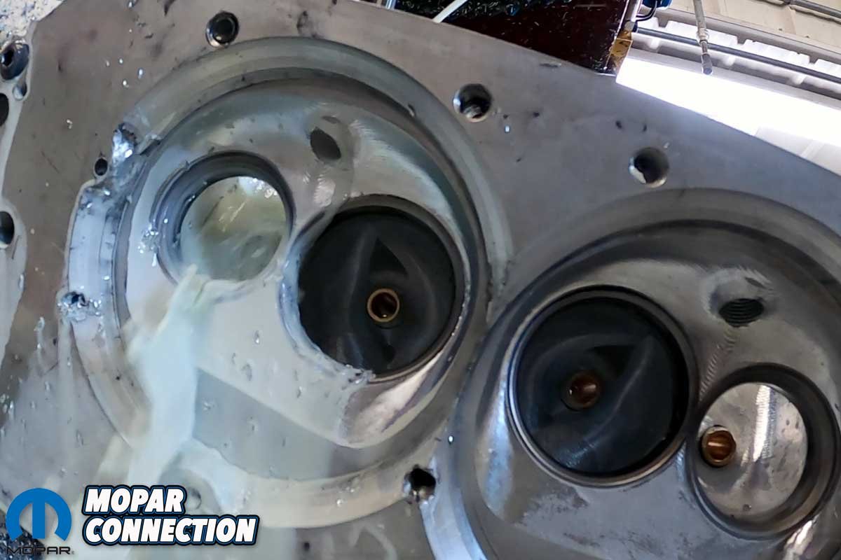 To finish the headwork, White measured the ccs of the combustion chambers to determine how much milling would be required to return the compression ratio to the recommended numbers. Next, the heads were milled in a surfacer machine to provide the roughness average (RA) required for the head gaskets we would use. Finally, after all the machine work, White scrutinized the heads and cleaned up and deburred any minor imperfections in the machine work.