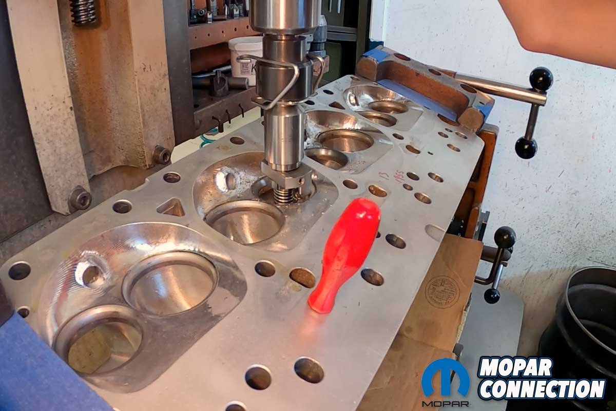 Above Left: White installed the valves at the specified installed height. Above Right: The combustion chambers were resized on the CNC machine to maintain the 84cc volume. Then, the cleaned valves were dropped into the cylinder head.