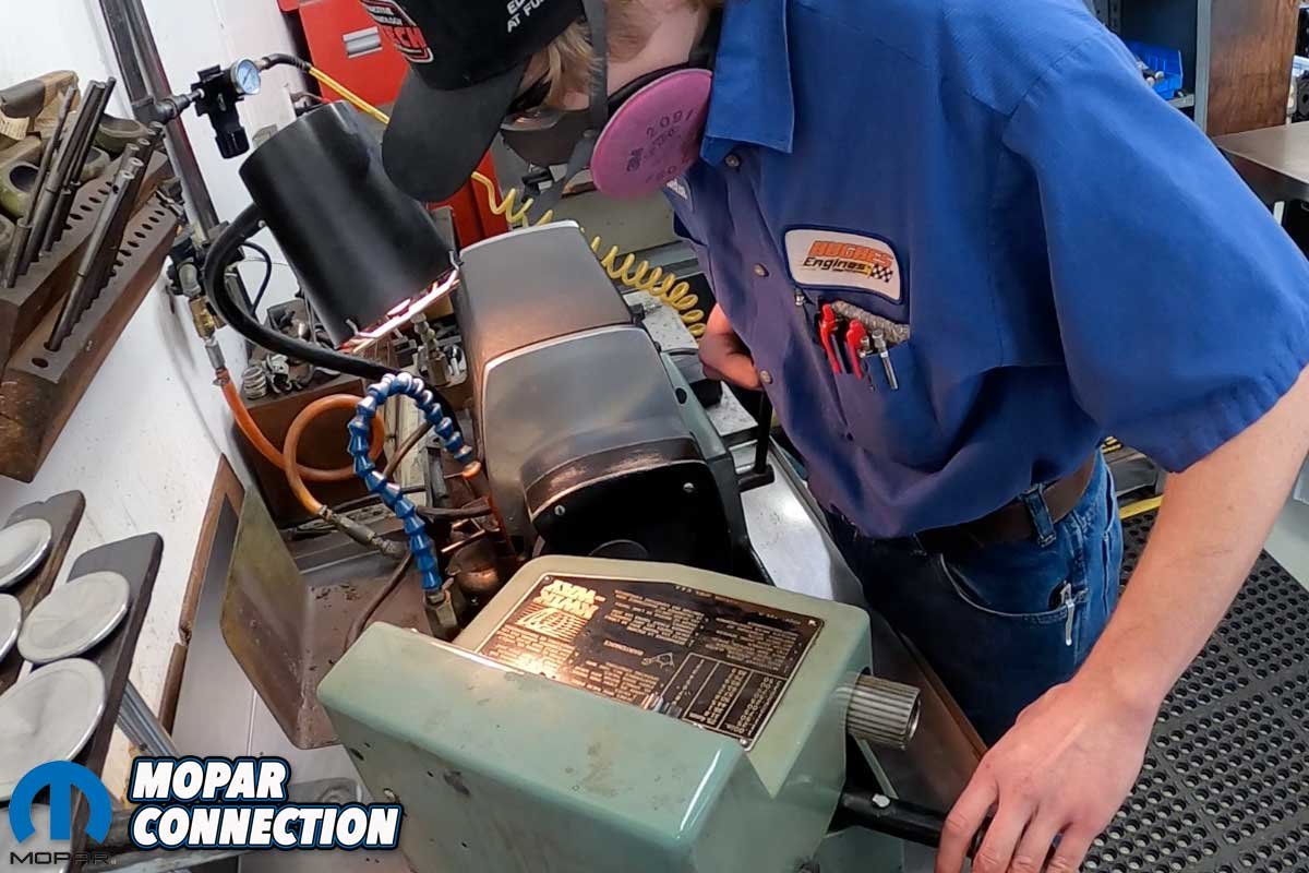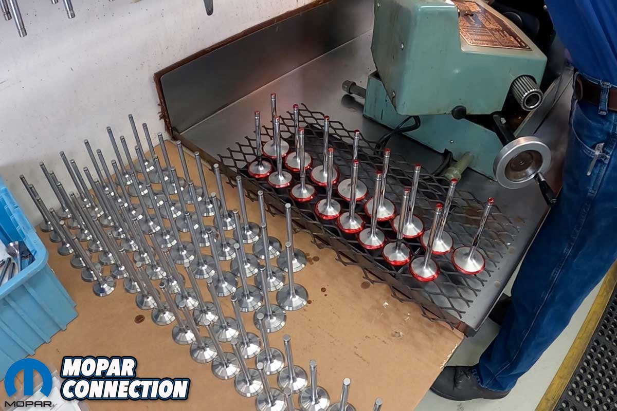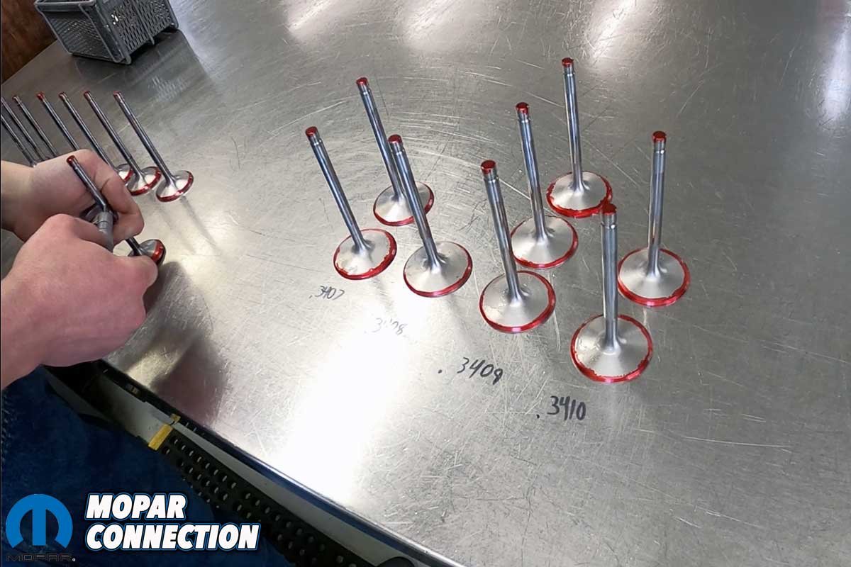 Above Left: The valves were lightly cut on a valve grinder and measured for stem size. Above Right: White lined up the valves based upon the stem diameter.