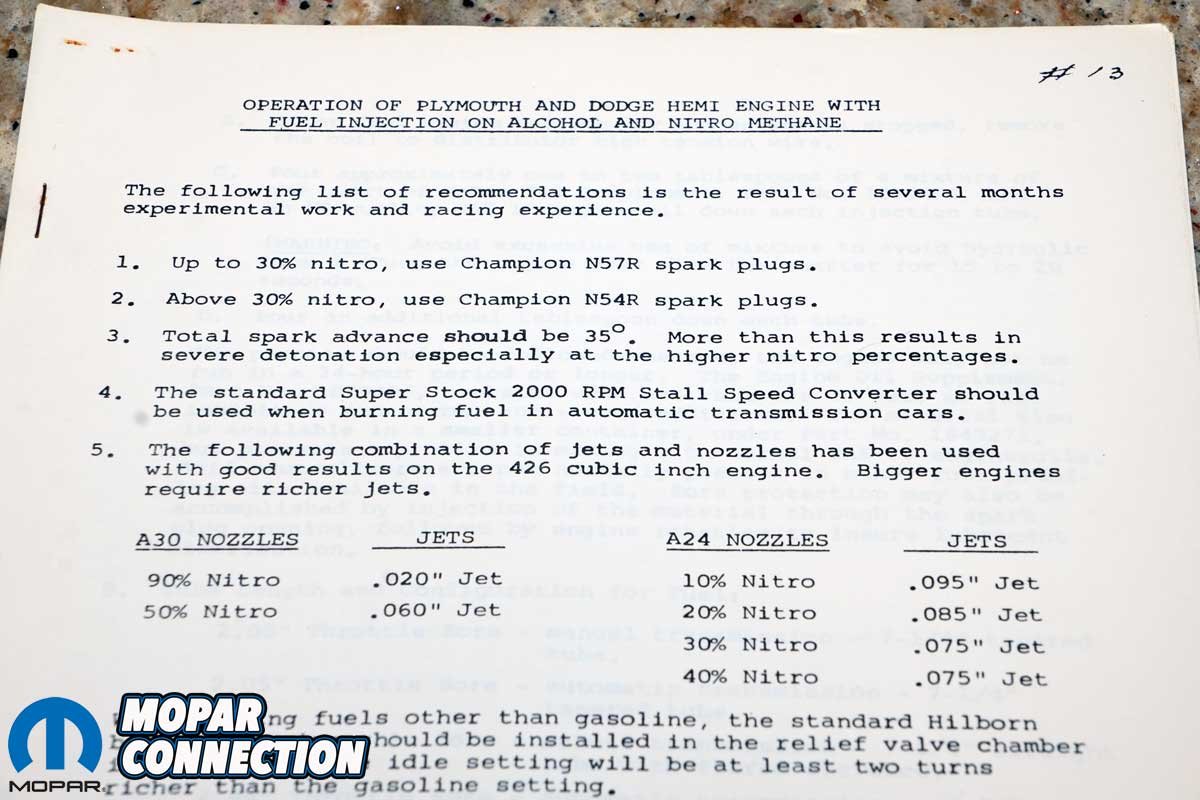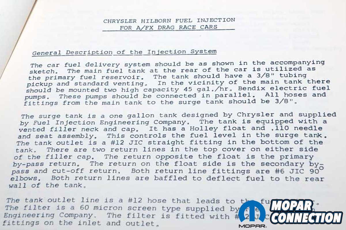 Above: Chrysler provided an extensive list of special parts from the Domestic Product Planning department. Additionally, it had in-depth technical information for those who wanted to run a Hemi on alcohol and nitromethane. Moreover, included with the documentation was how to run the A/FX class with Hilborn fuel injection. I wonder how many people converted to Hilborn injection on nitro based on the knowledge shared by Chrysler?