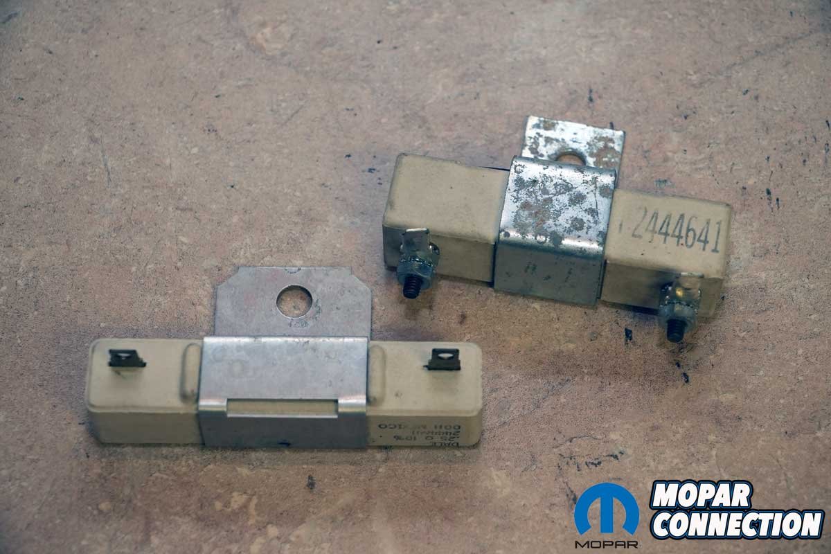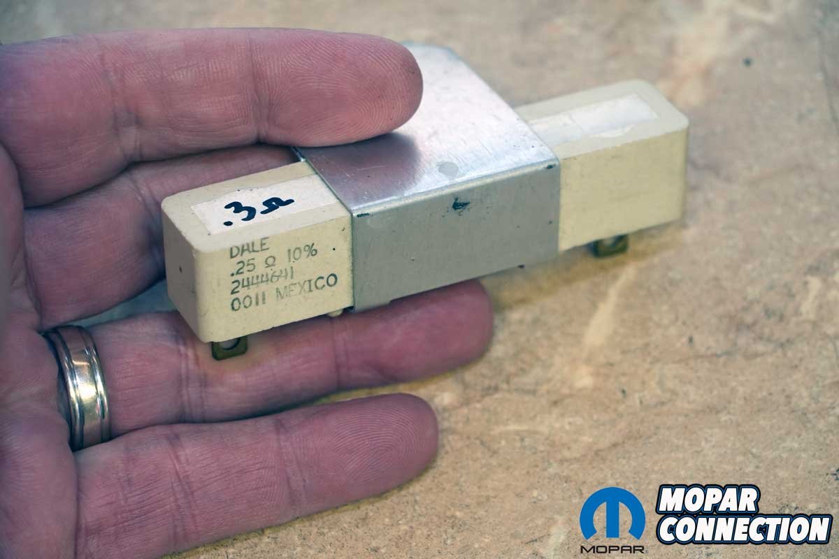 Above Left: Single ballast resistors come in several different appearances but perform the same task. The ballast resistor in a Mopar limits the amperage through the coil while the engine is running, thereby extending the life of the coil. With a 4-pin module, when the ignition key is in the start position, the total current is applied (ballast bypassed) to the coil and increases the voltage to the spark plugs. Above Right: Mopar electronic ignition systems with a stock coil should use a ballast with 1.2 – 1.4 ohms resistance, but race coils can work with higher amperage and a ballast with a lower resistance value. The ballast resistor in the photo has a resistance value of 0.3 ohms.